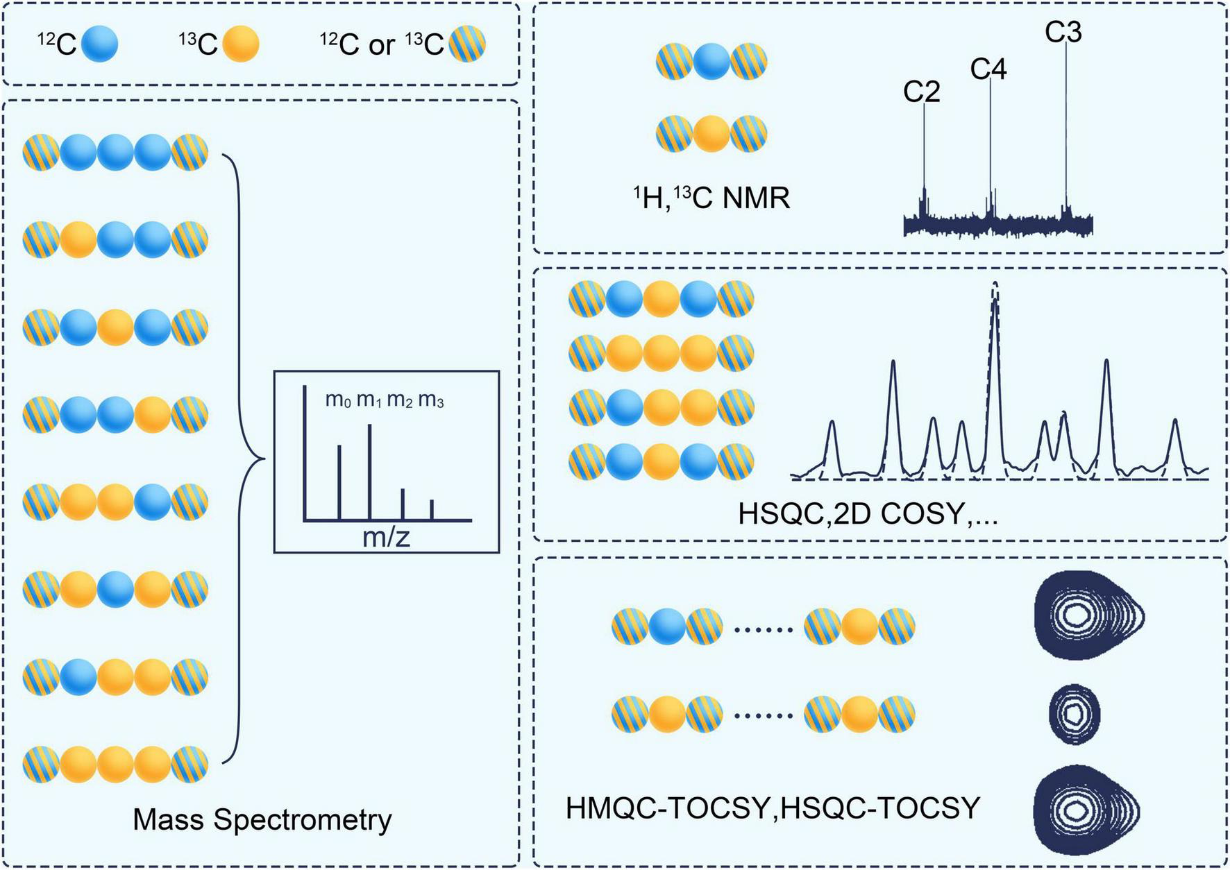 1D NMR of 1H and 13C can provide information on positional labeling enrichment as stated in ILM (Vinaixa et al., 2017; Deja et al., 2020; see Figure 5). Correlation Spectroscopy (COSY) is a 2D NMR technique that displays correlations between J-coupled nuclear by stepping up the delay between two 90°-proton pulses. Two-dimensional heteronuclear correlation spectroscopy (2D-COSY) (Szyperski, 1995), three-dimensional heteronuclear correlation spectroscopy (3D-COSY) (Boisseau et al., 2013) and proton-detected 2D heteronuclear single-quantum coherence (HSQC) (Lane et al., 2019) can detect the fraction of a specific subset of isotopomers. The set is a fragment of 3 continuous carbon atoms. Its middle carbon is 13C, while the carbons on both sides are 12C or 13C. 2D heteronuclear multiple quantum coherence-total correlation spectroscopy (HMQC-TOCSY) (Carvalho et al., 1998) and 3D total correlation-heteronuclear single-quantum coherence (TOCSY-HSQC) can detect another type subset of isotopomers (Reardon et al., 2016). This set is a fragment of continuous carbon atoms in the same spin system. One of its ends is 13C, and the other may be 12C or 13C. A non-uniform sampling technique can be used to improve the sensitivity and resolution of the fine structure in NMR spectrometry (Lee et al., 2017).