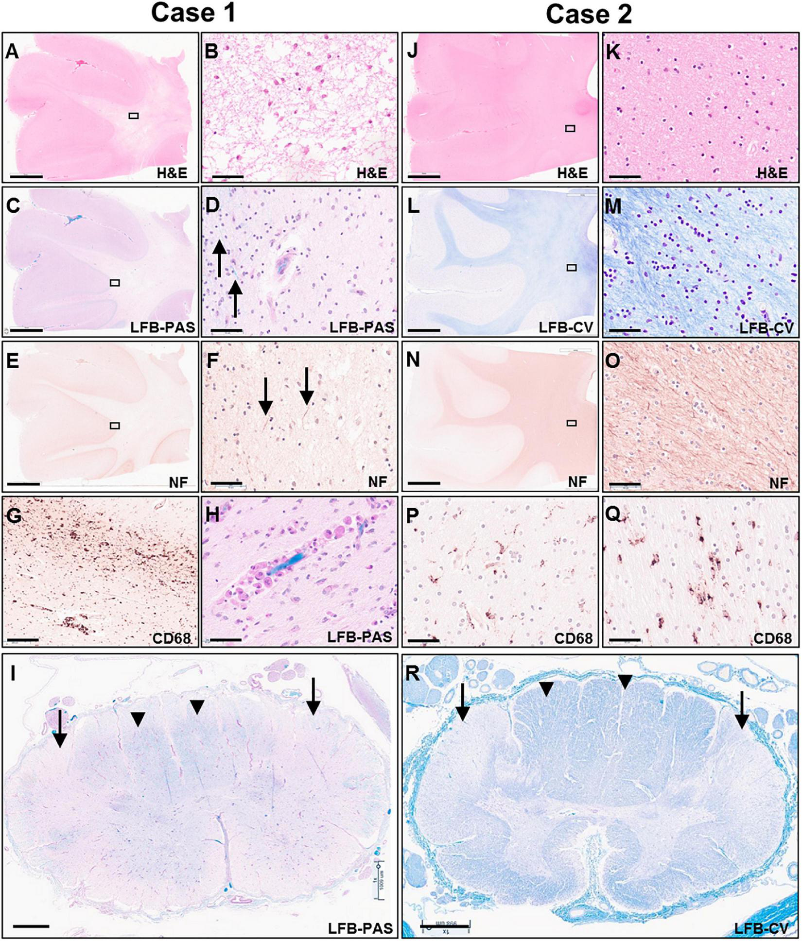 Photomicrographs of representative H&E (A,B,J,K), LFB-PAS (C,D,H,I), LFB-CV (K,L,R), neurofilament (E,F,N,O) and CD68 (G,P,Q) stained sections of the untreated case 1 (left two columns) and transplanted case 2 (right two columns). The rectangular boxes in the low power images indicate the region shown in the adjacent higher-power image. Images (A–H,J–Q) show frontal lobe (middle frontal gyrus) and images (I,R) demonstrate thoracic spinal cord. Arrows in images (D,F) indicate rare residual axons in case 1. Arrows in panels (I,R) point to the lateral corticospinal tracts, whereas arrow heads indicate posterior columns. Scale bars are set to 5 mm in panels (A,C,E,J,L,N); to 1 mm in panels (I,R); and to 50 μm in panels (B,D,F,G,H,K,M,O,P,Q).