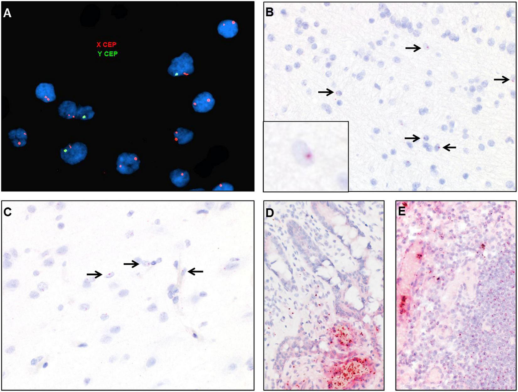 Identification of donor-derived male cells by DNA in situ hybridization with X (red) and Y (green) centromere probes of the white matter of case 2 (A) and by RNA in situ hybridization with Y-specific probes (red) and hematoxylin counterstain of cortical white matter (B), cortical gray matter (C), small bowel (D), and lymph node (E). Arrows point to scattered cells with small dot-like positive signal.