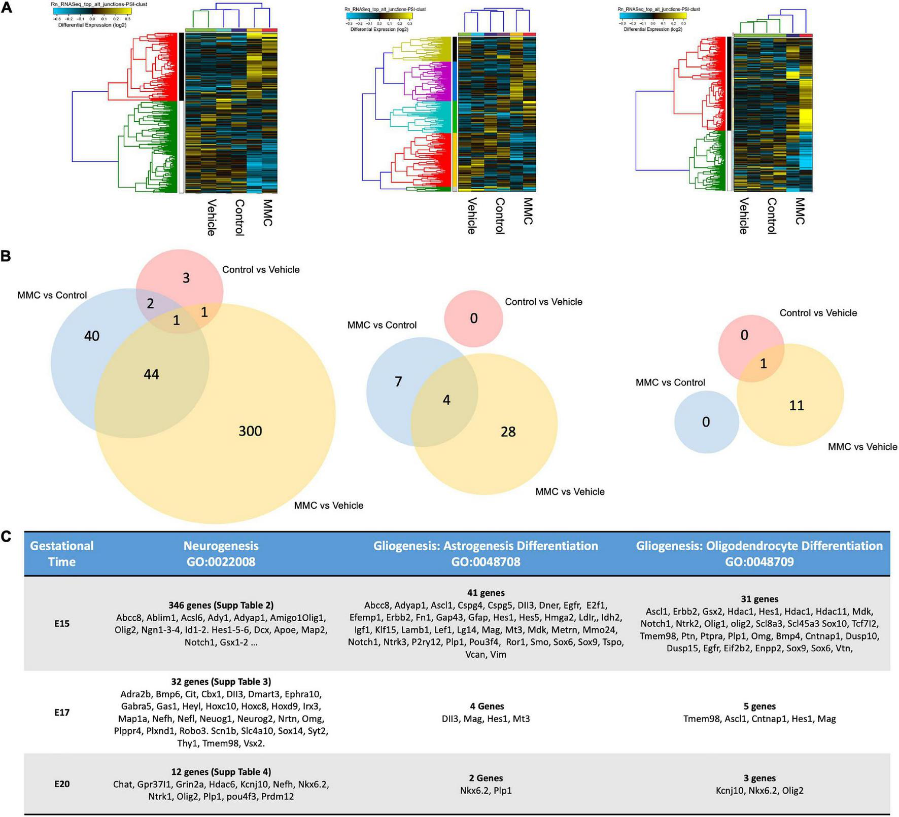 Cluster analysis of differentially expressed genes. (A) Hierarchical cluster analysis of differentially expressed genes showed transcriptome-wide expression patterns similar between the control and vehicle groups compared to MMC samples in all three gestational ages E15, E17, and E20 days. (B) Venn diagram of the DEGs in different comparisons. The numbers indicate unique and common DEGs in two duplicates for different comparisons MMC vs. VC, MMC vs. NC and NC vs. VC. (C) Analysis of two sub-classifications within the Neurogenesis GO, Oligodendrocyte Differentiation (GO:0048709), and Astrocyte Differentiation (GO:0048708) DEGs between the control and vehicle groups compared to MMC at E15, E17, and E20 days.