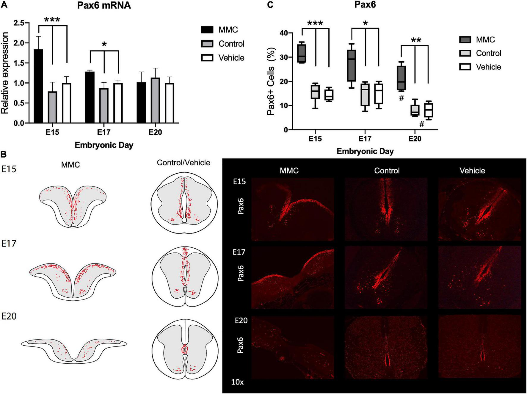 Pax6 expression and distribution in spina bifida. (A) Pax6 relative expression increased in spina bifida (MMC) compared with control and vehicle spinal cords at E15 and E17. Values (means ± SE, 6 fetuses/group) of relative expression (2– ΔΔCt) for RA-treated and time-matched controls (*p < 0.05, ***p < 0.001). (B) Schematic representation of Pax6 distribution in MMC and control fetal spinal cords at E15, E17, and E20 (left). Pax6+ staining in MMC, control, and vehicle spinal cords at E15, E17, and E20 (right) (10×). Pax6+ (red) immunoreactive NPC cells exposed at E15, E17, and E20 in spina bifida (10×). (C) % Pax6+ NPC in spina bifida, control and vehicle spinal cords determined by Pax6 stained cells/total cells at three gestational ages E15, E17, and E20 (means ± SD, *p < 0.05, **p < 0.01, *p < 0.001, #p < 0.05 between E20 and E15).