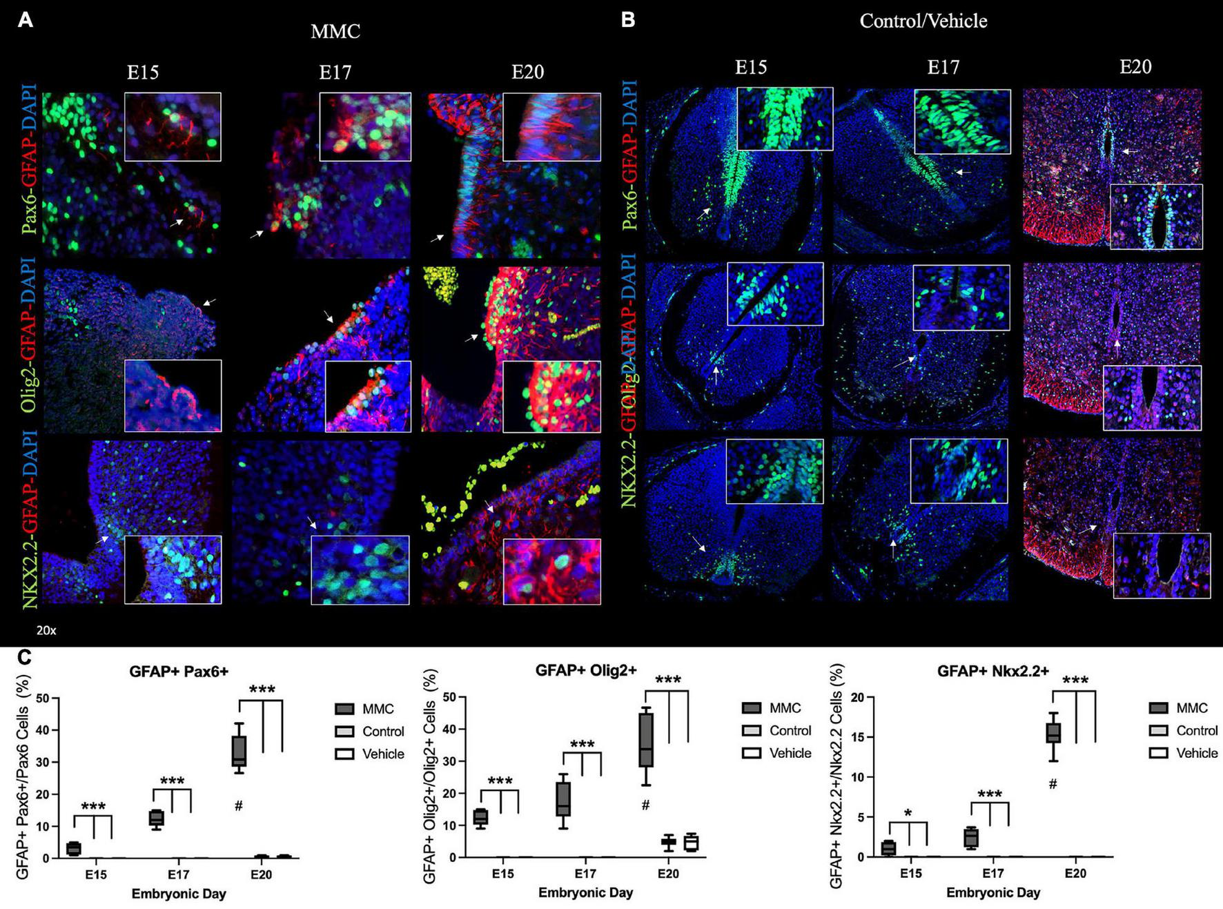 Next, we sought to examine the developmental origin of the glial cells in the VZ exposed to amniotic fluid in MMC fetuses by assessing the co-expression of GFAP and patterning factors, Pax6, Olig2, and Nkx2.2, at each time point studied. At E15 and E17, astrocytes (GFAP+ cells) located in the VZ of MMC fetal spinal cords were exposed to amniotic fluid and expressed Olig2 or Pax6 (Figure 9A). At these time points, GFAP expression was not observed in Nkx2.2+ cells around the p0 domain (Figure 9A) (arrows). As previously observed, GFAP expression was not detected in control and vehicle spinal cords at these time points (Figure 9B). At E20, GFAP+ astrocytes found in the VZ of MMC fetal spinal cords expressed Pax6, Olig2, and Nkx2.2 (Figure 9A). On the contrary, GFAP+ cells were found in the white matter at the sub-pial region in control and vehicle spinal cords and did not express Pax6, Olig2, or Nkx2.2 (Figure 9B). This increase in co-expression of GFAP and Pax6, Olig2, and Nkx2.2 compared to controls (*p < 0.05, **p < 0.01, ***p < 0.001) (also is increased at the end of gestation compared to E15 and E17 (#p < 0.05, control and vehicle E20 vs. E15 and E17) (Figure 9C). These results demonstrate the expression of an astrocyte marker (GFAP) in VZ NPC (Pax6, Olig2, and Nkx2.2) that could lead to astrogenesis in the VZ exposed to the amniotic fluid in MMC fetuses.