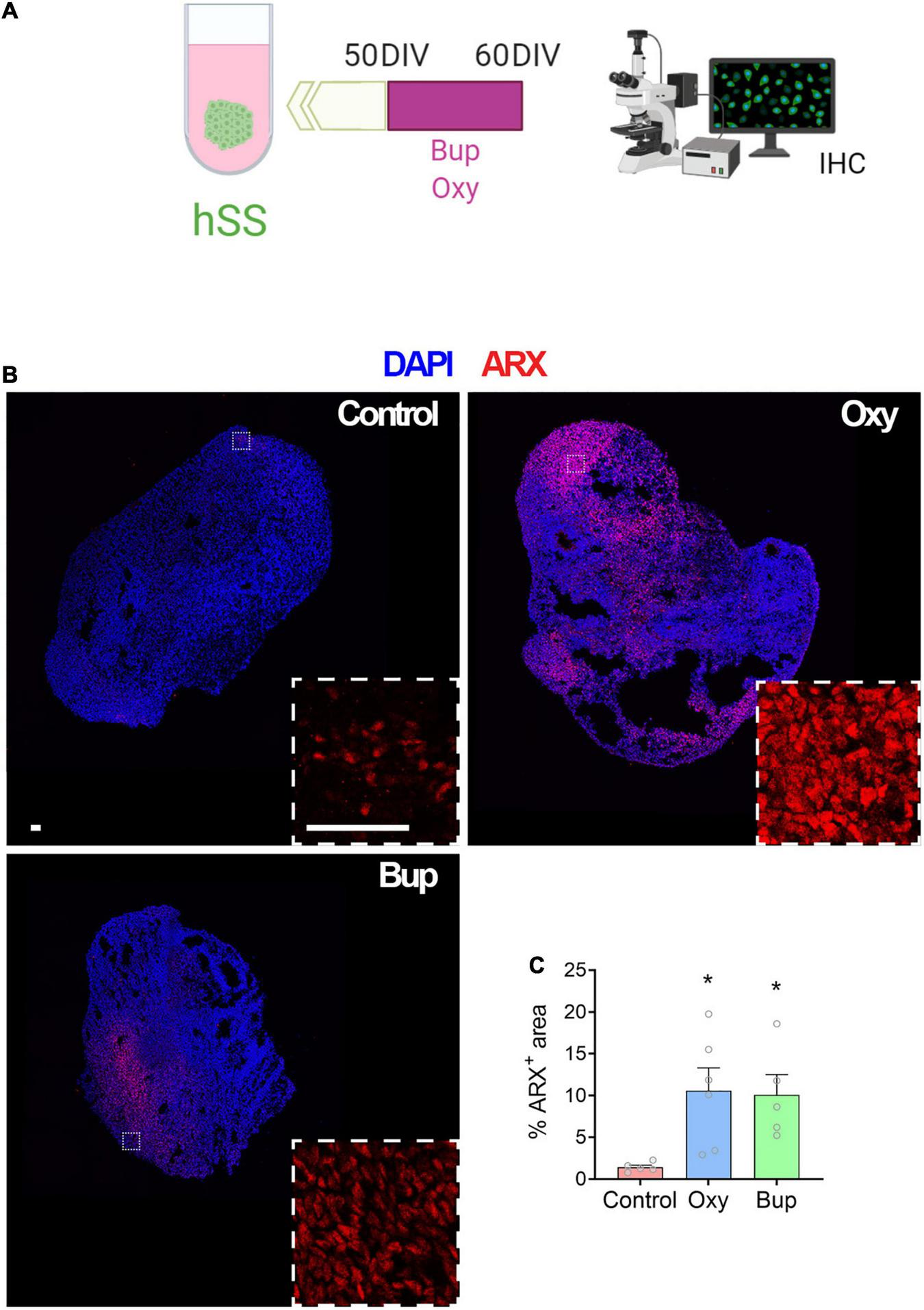 Figure 2. Buprenorphine alters markers of interneuron development in subpallial spheroids. The experimental design is depicted in (A). Representative images of ARX immunolabeling (B). Both oxycodone and buprenorphine treatment increase ARX area in subpallial spheroids (C). n = 5-6 organoids. Scale bar = 50 μm. *p < 0.05. DIV,days in vitro; IHC,Immunohistochemistry.