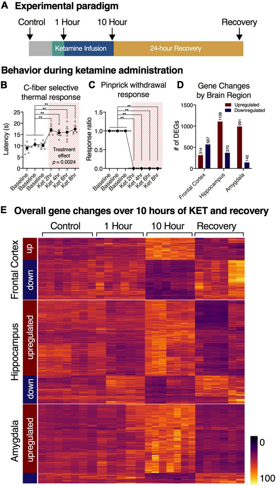 Experimental overview and summary of RNA-Seq findings. (A) Timeline of experimental procedures. RNA-Seq was performed on the frontal lobe, hippocampus, and amygdala from sham operated controls (n = 7), 1 h infusion (n = 6), 10 h infusion (n = 7), and 10 h infusion + 24 h recovery (n = 6). (B,C) Response to thermal C-fiber activation, and mechanical pinprick are attenuated during the ketamine infusion. These responses indicate blockade of pain sensation in both modalities. Statistics were performed using a mixed-effects model (thermal), or binomial test (pinprick) with Holm-Šidák corrections (n = 6). Error bars show standard error of the mean. For pinprick response (C), no variance was observed. (D) Total number of genes regulated as assessed by RNA-Seq. Differentially expressed genes (DEGs) were defined as those with adjusted p-value < 0.01 and had > 40% expression ratio at 10 sFPKM (variable expression ratio threshold, see “Materials and Methods”). Datasets were analyzed using statistical package limma. The total number of genes meeting threshold were as follows: Frontal Cortex: 314 up, 567 down; Hippocampus: 1109 up, 370 down; Amygdala: 991 up, 142 down. Note that in the amygdala and hippocampus there were more upregulated genes, whereas in the frontal cortex roughly equal numbers of significantly up- and downregulated genes were observed. (E) Clustering of gene changes by brain region. Note that the most prominent gene changes occurred at the 10 h time point, and the genes clustered according to direction at 10 h.