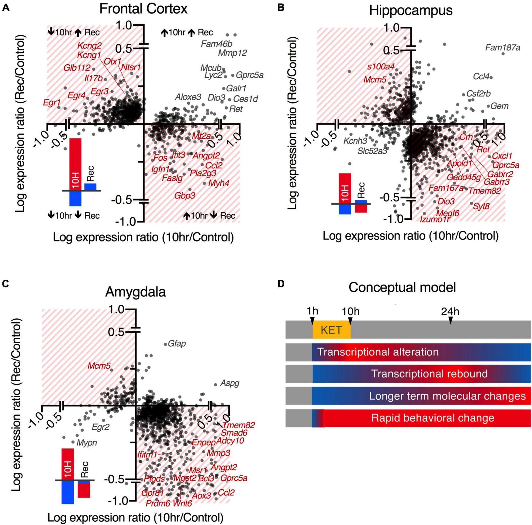 Comparison of 10 and 24 h recovery gene changes. (A–C) Expression ratios are compared between the 10 h/control data and the recovery/control. Log-transformed expression ratios of 10 h vs. control (x-axis) and recovery vs. control (y-axis) are shown for all DEGs by brain region. Genes that show rebound transcriptional changes opposite to the direction of regulation at 10 h are highlighted in hatched quadrants (quantified in the red and blue bar graphs in lower left quadrants). Example genes with the highest levels of discordant regulation at 10 h and Rec are labeled in red. Genes with the highest levels of concordant regulation (do not return to baseline) are in the clear quadrants and are labelled in gray. Note that there appears to be a tendency toward increased numbers of genes in the hatched quadrants generally, and that there is more tendency for the genes to move in the opposite direction in the recovery among genes decreasing in the frontal lobe (A) or increasing in the hippocampus (B) or amygdala (C). (D) A conceptual model is shown for the temporal dynamics of the observed transcriptional events. Transcriptional events, which are the primary endpoints of RNA-Seq, have known temporal dynamics with a T1/2 of mRNA estimated at ∼2.5–3 h (Singer and Penman, 1972). The 10 h time point was selected because it is about 4 half-lives, implying near total turnover. Return to transcriptional homeostasis after withdrawal of the drug does not necessarily coincide with the end of the ketamine-induced process, as translational processes, protein level, post-translational modifications, network-level, and behavioral alterations may persist. The observations at the 24 h time point also suggest a tendency toward transcriptional overshoot or “rebound” rather than return to homeostasis.