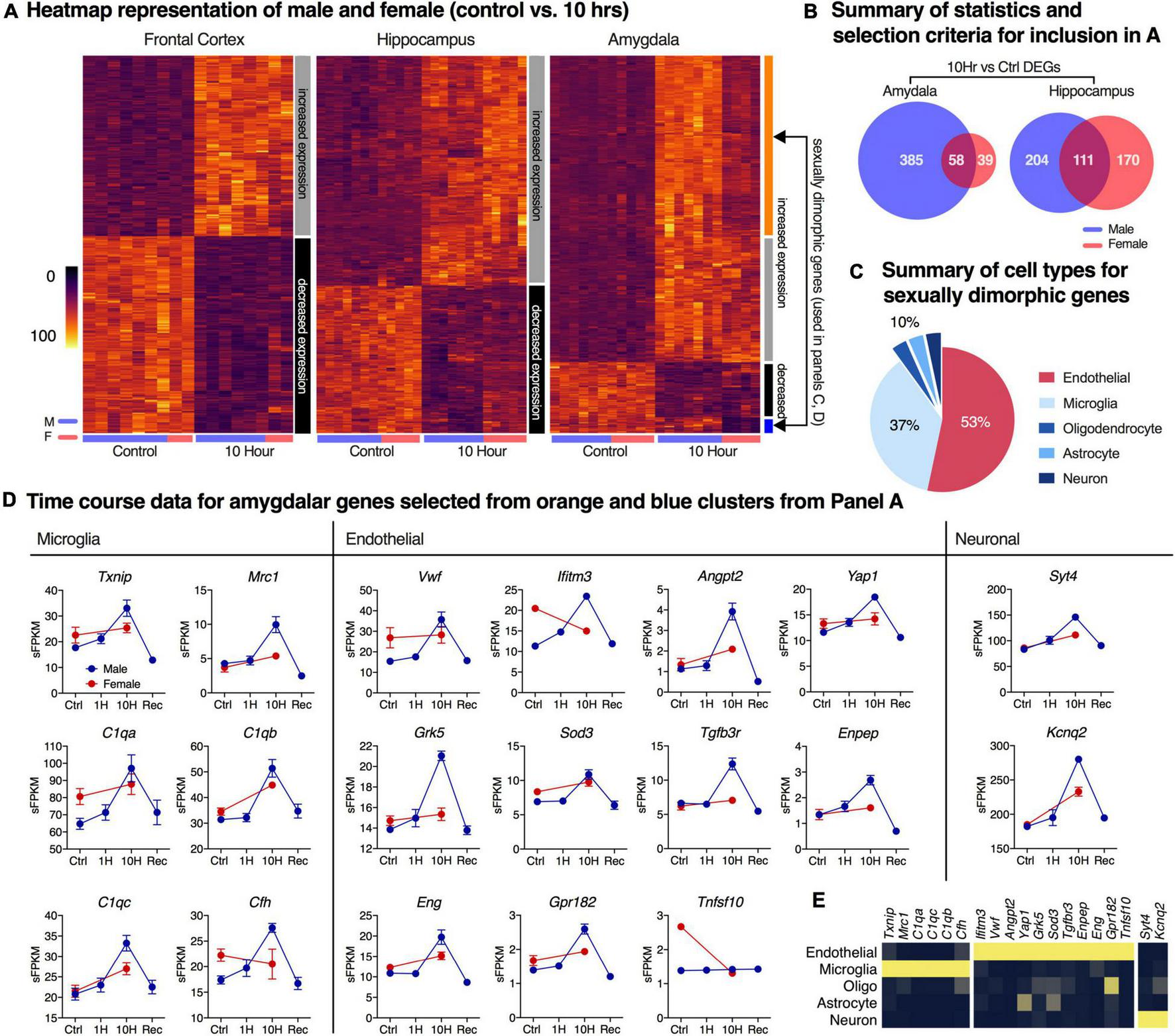 Analysis of sexually dimorphic differentially expressed genes after ketamine infusion. Differentially expressed genes (DEGs) in control vs. 10-h groups in both male and female datasets were identified independently using pairwise comparisons in limma. (A) Hierarchical clustering was performed for genes that were differentially expressed at 10 h in at least one sex. The color bar to the right of each heatmap shows the clusters. DEGs show largely concordant induction (gray) or downregulation (black) between sexes in all brain regions. In the amygdala, two additional sexually dimorphic gene clusters were observed (orange, blue). (B) Non-concordant amygdaloid genes were categorized by cell type by referring to basal cell expression dataset from a previously published resource (Zhang et al., 2014). Cell type representation in the top 30 most non-concordant genes are shown, demonstrating large endothelial and microglial signatures. (C,D) Genes meeting discordance thresholds with high levels of specificity to cell type are shown (red = female, blue = male). (E) Expression data from Zhang et al. (2014) for endothelial cells, microglia, oligodendrocytes, astrocytes and neurons are shown for the selected genes in D, showing their high degree of enrichment in their respective cell types according to that dataset. The microglia genes mainly represent the complement cascade. The endothelial genes include a GPCR for the vasodilatory peptide adrenomedullin, a GPCR kinase, as well as genes in the TGFβ family and others consistent with a complex network of endothelial regulation. Error bars show the standard error of the mean.