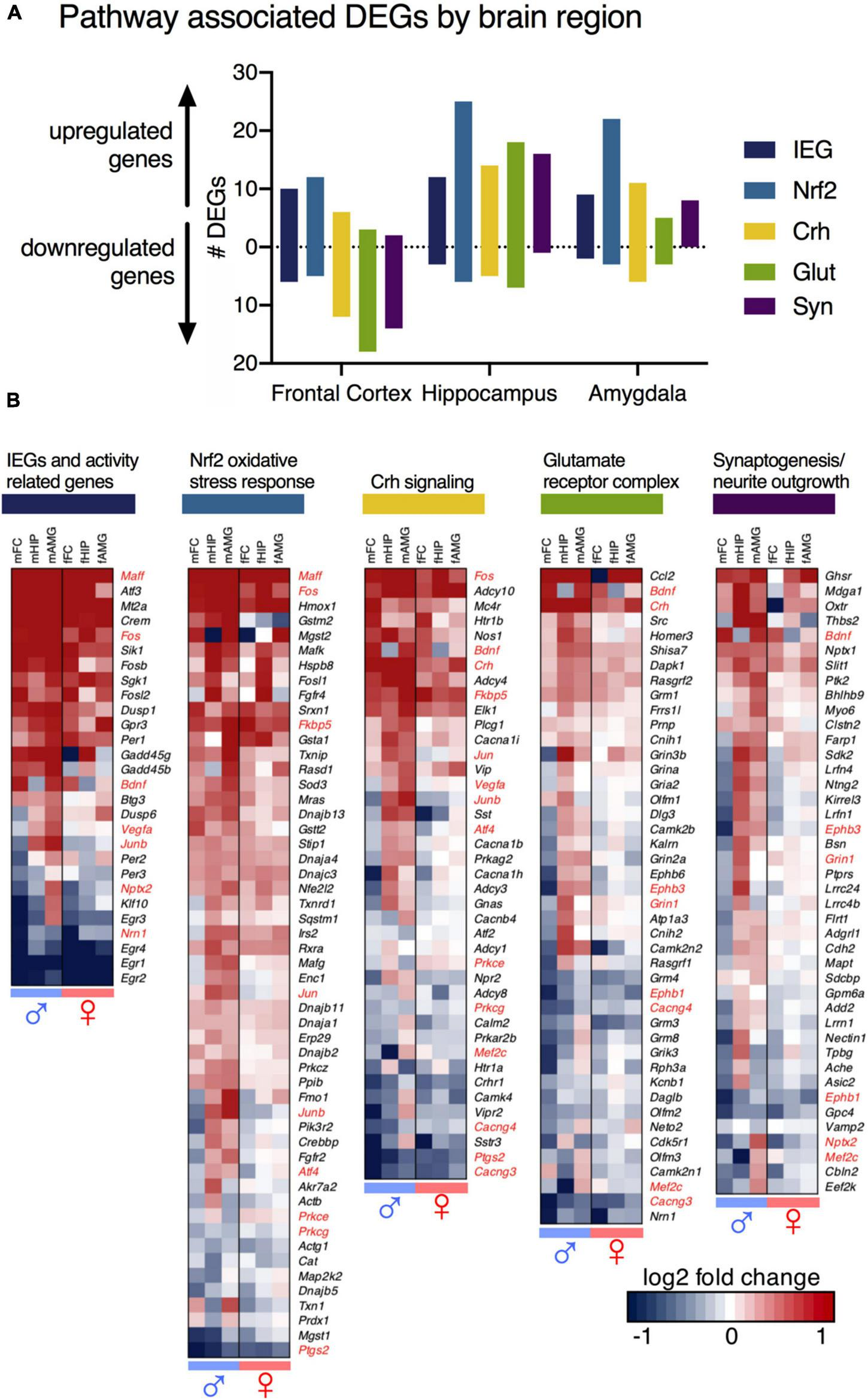 Subsequent analysis was performed to identify Gene Ontology term enrichment using Ingenuity Pathway Analysis (IPA, Qiagen) and the DAVID Bioinformatics Resource (Huang et al., 2009). Outputs from Ingenuity are shown in Supplementary Table 9. The raw outputs from Ingenuity contained several pathways that were of low priority for the study. As an alternative, we selected pathways that highlighted genes that were strongly expressed with the highest fold changes in our dataset (Supplementary Figure 6), and used the existing literature to refine and build gene networks that were relevant to the present study. Gene Ontology term enrichment analysis was performed for males based on the maximum expression ratio between any two time points within the time course, as calculated in Supplementary Figure 3. For females, the expression ratio between control and 10 h was used for Gene Ontology analysis. For heatmaps displaying pathway alterations, the individual gene lists were supplemented with literature review to construct a more comprehensive pathway. The end result was curated to the present dataset relative to the generic pathways from Gene Ontology analysis. Log2 expression ratios for each of the 6 datasets examined (3 brain regions x 2 sexes) were used to create heatmaps of the individual pathways. These pathways also were clustered as described above using the ward.D2 method.