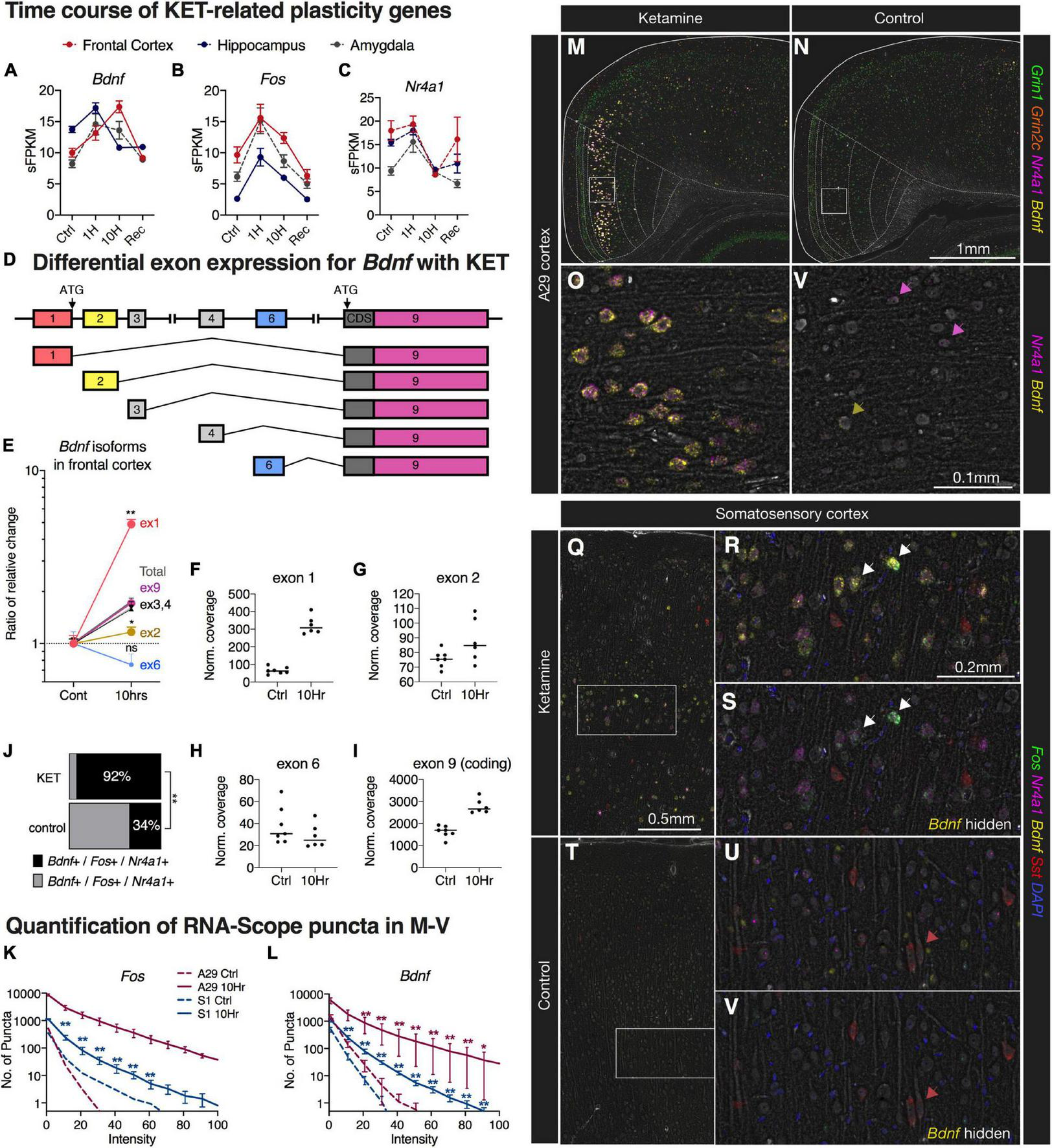 Animals were deeply anesthetized with isoflurane for < 3 min and perfused intracardially with cold phosphate buffered saline, followed by 4% paraformaldehyde. The brain was removed from the skull and divided into left and right hemispheres and post-fixed with 4% paraformaldehyde for a minimum of 12 h but not more than 24 h. The frontal lobe was isolated anterior to corpus callosum and marked with dye. A ∼3mm coronal slice containing CA1–CA3 and the amygdala was then cut. All tissue was embedded in paraffin blocks and mounted as 6 μm sections by Histoserv Inc. (Germantown, MD). Sections from the paraffin blocks were taken starting from the caudal aspects of the embedded frontal lobe and the from the rostral face of the hippocampus/amygdala block. Sections from paired control and 10 h animals were mounted on one slide, stained, and scanned concurrently. RNAscope® Multiplex Fluorescent assays v2 (Advanced Cell Diagnostics, Newark, CA) with Tyramide Signal Amplification (Opal™ Reagent Systems; Perkin Elmer, Waltham MA) was used for multiplex in situ hybridization. Staining protocols followed manufacturers’ recommendations. The following Advanced Cell Diagnostics (Newark, CA) RNAscope® Probes were used: Rn-Grin1 (Cat No. 317021), Rn-Grin2C (Cat No. 543951), Rn-Nr4a1 (Cat No. 414571), Rn-Bdnf (Cat No. 317541), Rn-Fos (Cat No. 403591), Rn-Sst (Cat No. 412181). Image capture from the stained sections was performed with a Axio Imager.Z2 slide scanning fluorescence microscope (Zeiss, Oberkochen, Germany) equipped with a 20X/0.8 Plan-Apochromat (Phase-2) non-immersion objective (Zeiss), a high-resolution ORCA-Flash4.0 sCMOS digital camera (Hamamatsu), a 200W X-Cite 200DC broad band lamp source (Excelitas Technologies, Waltham MA) and 5 customized filter sets (Semrock, Rochester NY) optimized to detect the following fluorophores: DAPI, Opal520, Opal570, Opal620, Opal690. Image tiles (600 × 600 μm viewing area) were individually captured at 0.325 micron/pixel spatial resolution, and the tiles seamlessly stitched into whole specimen images using the ZEN 2 image acquisition and analysis software program (Zeiss). Stitched images were overlaid as individual layers to create multicolored merged composites and subsequently analyzed using Fiji version 2.0.0-rc-69/1.52n (Schindelin et al., 2012) to quantify signal intensity and area of puncta. For each stained section, a region of interest (ROI), as determined by anatomical landmarks according to a rat brain atlas (Paxinos and Watson, 2014) was specified and the total number of puncta per intensity measurement was recorded. Puncta counts were then binned per 10 intensity levels (0–255). Each animal served as a statistical unit (one section quantified per animal). For representative images, color thresholds were applied equally to matched control and experimental images to distinguish color balance in Adobe Photoshop (version 20.0.0). To show a signal at low magnification color intensity was substantially enhanced for representative images in some cases. This enhancement was performed uniformly throughout the whole section and was performed identically for controls and ketamine-treated animals. Note that the Nr4a1 signal in the 620 channel was not quantified in terms of signal intensity due to signal bleed from the 570 channel (Fos). However, unique Nr4a1 puncta (without pixel overlap from the 570 channel) were used to count Nr4a1 + cells.
