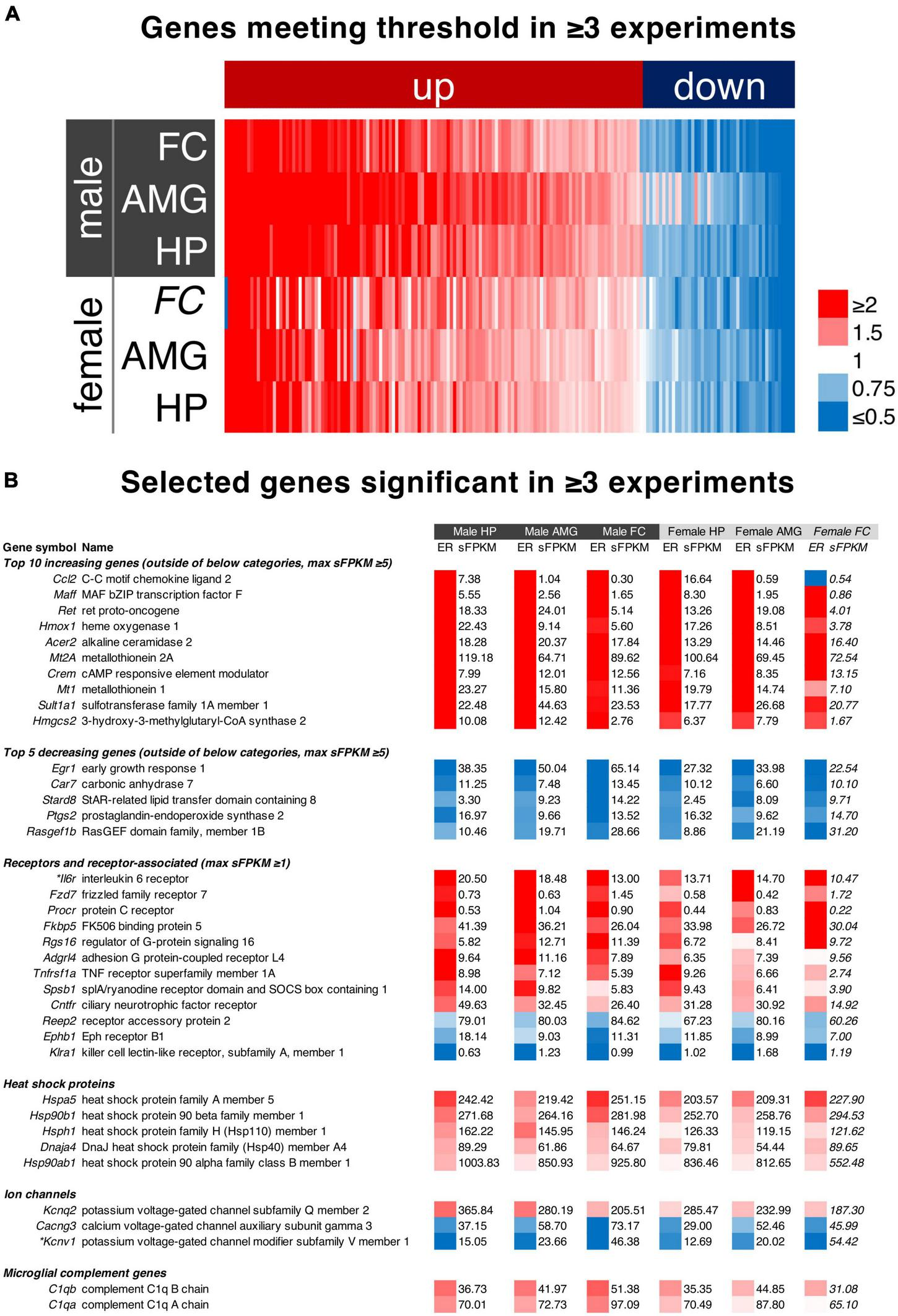 In order to address the most highly significant genes in the dataset we created a filter based on significance (meeting threshold) in three of the five individual experiments in which significance was tested. The list of genes, significance values, and expression data for these genes is found in Supplementary Table 10). Maximum expression ratios (calculated as the maximum change across the time course) for each of the six datasets in the paper were sorted by average expression ratio and plotted in a heatmap (Figure 7A). The top 10 increasing, and top 5 decreasing genes (Figure 7B) with a maximum sFPKM ≥ 5 were selected and sorted by expression ratio. Note that for the decreasing genes this is in ascending order such that the genes decreasing most are first. Three additional categories of genes were selected. Receptors and ion channel genes were selected due to their importance in pharmacology research. Heat shock protein genes were also selected because of their high level of expression.