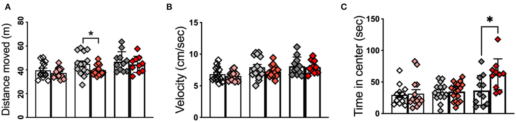 OF test revealed significant differences in the duration that APPKI mice spent in the center. At 6 m of age, APPKI mice moved significantly less distance compared with WT, suggesting a decreased exploration activity in the 6-m APPKI mice (Figure 1A). This is consistent with findings from Sergeant Lab that reported a reduction in open-field activity in the absence of memory deficit in the APPKI mice (Whyte et al., 2018). No significant difference was observed in the moving velocity at all three time points, although we see a decreasing trend between 6-m APPKI mice and age-matched WT (p = 0. 1541, two-tailed Student's t-test) (Figure 1B). Further analysis of duration in the center area of the open arena revealed no significance observed at 3 and 7 m, while 12-m APPKI mice exhibited a longer exploration time in the center compared with age-matched WT mice (Figure 1C). Rodents typically prefer not to be in the center (open area of the arena) and tend to move closer to the walls (thigmotaxis), since the center poses the risk of being exposed to a potential predator. Increased time spent exploring the center area could be interpreted as an indicator of risk-taking behavior or a lack of inhibition (Momeni et al., 2014). These data show that 12-m APPKI mice exhibit a significant disinhibition in the open field by spending more time in the center. No significant difference was observed in total distance traveled or velocity in APPKI mice at all three age points (Figures 1B,C).