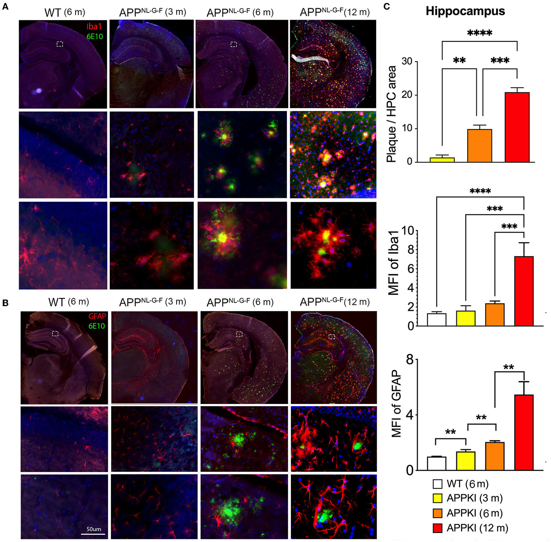 Since we have observed hippocampus-dependent learning and memory deficit, we thus performed immunofluorescence microscopy for neuroinflammation and amyloidosis and specifically quantized these markers in the hippocampal region. Aβ was stained with 6E10, microglia were identified by Iba-1, and astrocytes were stained with GFAP in brain sections. As expected, amyloid plaque deposition and neuroinflammation significantly progressed with age. While the accumulation of Aβ initially occurred at 3 m with astrocytes and encasing microglia (Figures 4A,B), prominent Aβ pathology was observed, especially in the piriform cortex, at 6 m. In contrast, less Aβ accumulation was observed in the hippocampus. In the hippocampus, Aβ accumulation is more enriched in CA3 and CA1, while the dentate gyrus is relatively spared. As shown in Figure 4C, activated microglia can be observed surrounding Aβ deposits in 3 m, while activated astrocytes surrounding Aβ deposit were significantly more pronounced in 6-m APPKI hippocampus. With the disease progress to the late stage, a robust accumulation of Aβ and over-reactive microglia and astrocytes was detected throughout the brain in 12-m APPKI mice.