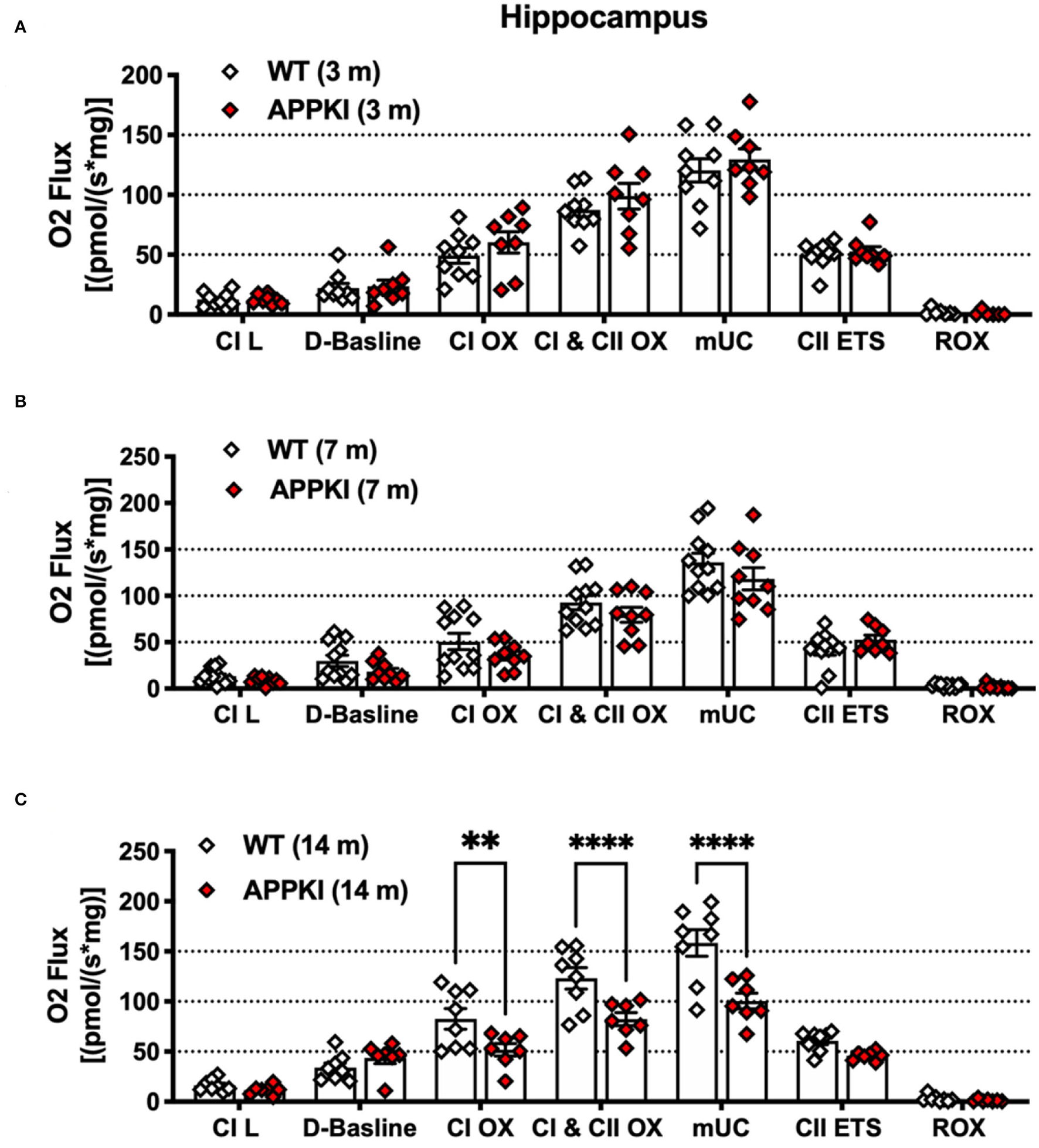 Mitochondrial respiration was decreased in 14-m APPKI hippocampal tissue. (A–C) Quantification of mass-specific oxygen flux from 3-m, 7-m, and 14-m APPKI and age-matched WT mice hippocampal homogenates. The horizontal bar denotes the respiratory states; L: Leak. Data are presented as mean ± SEM; n = 6–11 mice per group. Data were analyzed using one-way analysis of variance (ANOVA) followed by Bonferroni's multiple comparison test. Significance was assumed when p < 0.05. **p < 0.01, ****p < 0.001.