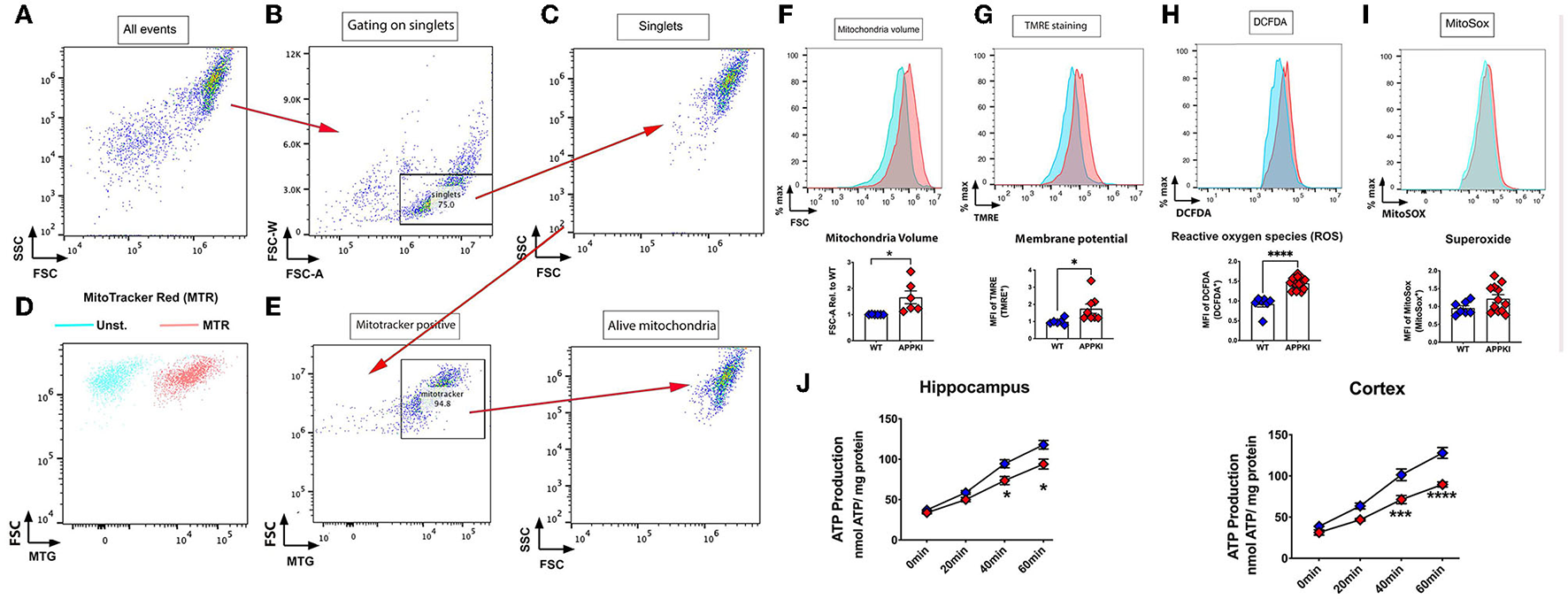 Mitochondrial dysfunction was observed in 7-m APPKI mice brain. (A) Isolated hippocampal mitochondria are visualized on a dot plot. (B) Doublets and singlets can be visualized by plotting FSC vs. FSC-W (linear mode). Doublets are excluded if the FSC-W value is more than two times the mean FSC-W value of the majority of events. Events under this threshold are gated as singlets. (C) Change the mode to dot plot again to visualize the gated singlet events to continue gating on the remaining events. (D,E) The unstained sample (blue events) and sample stained with a mitochondria-specific dye, MitoTracker Red (red events). Singlets were gated by MitoTracker and characterized for: (F) mitochondrial volume; (G) mitochondrial membrane potential; (H) ROS; (I) superoxide. (J) Decreased ATP production from purified mitochondria from hippocampal and cortical tissues. Data are presented as mean ± SEM; n = 3–4 mice per group with duplicates from each mouse. Data were analyzed using Student's t-test for F–I and two-way ANOVA for J. Significance was assumed when p < 0.05. *p < 0.05, ***p < 0.005, ****p < 0.001.