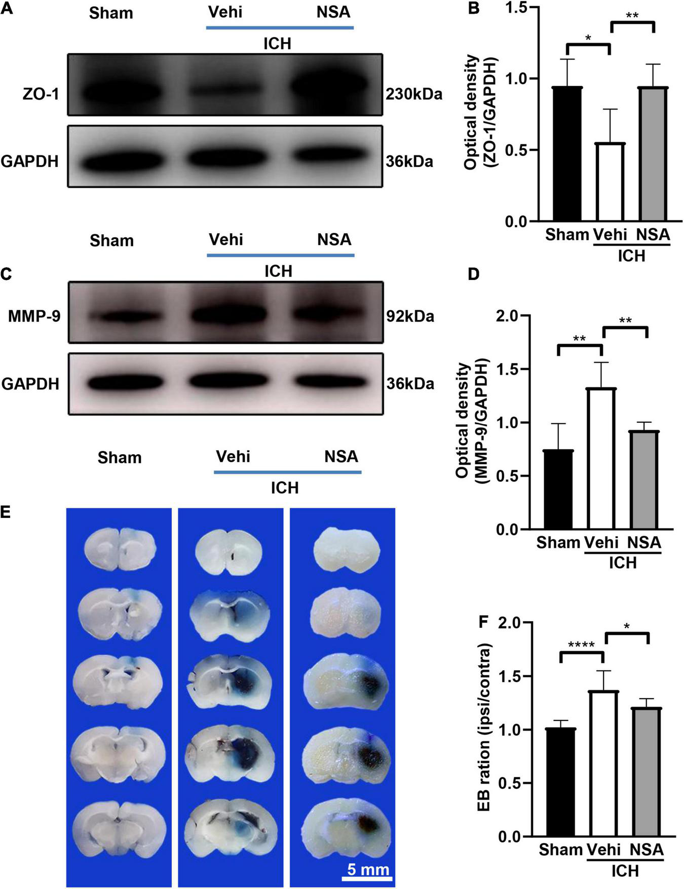 After ICH, BBB damage can result from pro-inflammatory cytokines and reactive oxygen species, which are secreted by the excess activation of microglia (Taylor et al., 2017). As well, the MMP-9 produced after ICH can not only enhance inflammation, and perihematomal edema, and cause lesional expansion, but also contribute to BBB disruption by degrading the extracellular matrix (Zhang et al., 2021). Therefore, the NSA-reduced MMP-9 (Figure 5) may help protect the BBB. It could be clearly noticed that ZO-1, which maintains the integrity of BBB, expressed a lot more in the NSA group than that in the vehicle group in our experiments. Furthermore, the results of EB extravasation indicated that the BBB in the treatment group mice functioned better than their counterparts in the vehicle group.