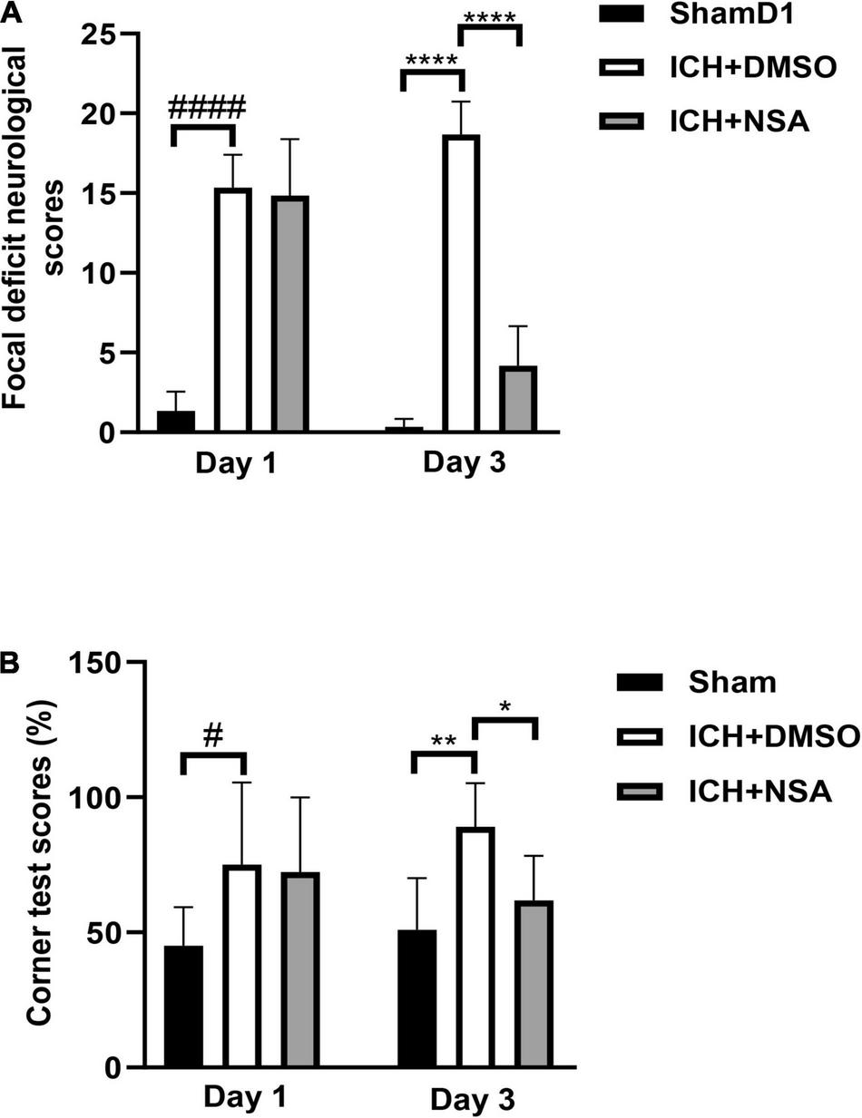 To determine whether NSA improved motor and sensory functions after ICH, we subjected mice to a battery of behavior tests at 24 and 72 h after injury. Focal deficit neurological scores and corner tests were evaluated 6 and 11 times, separately. All ICH groups had the same baseline pre-ICH, and after ICH at 24 h (Figure 6A), the vehicle and NSA groups displayed similar neurological impairments, with marked focal contralateral motor deficits. At 3 days, following ICH, however, focal deficit neurological scores were lower in the NSA compared to the vehicle group.