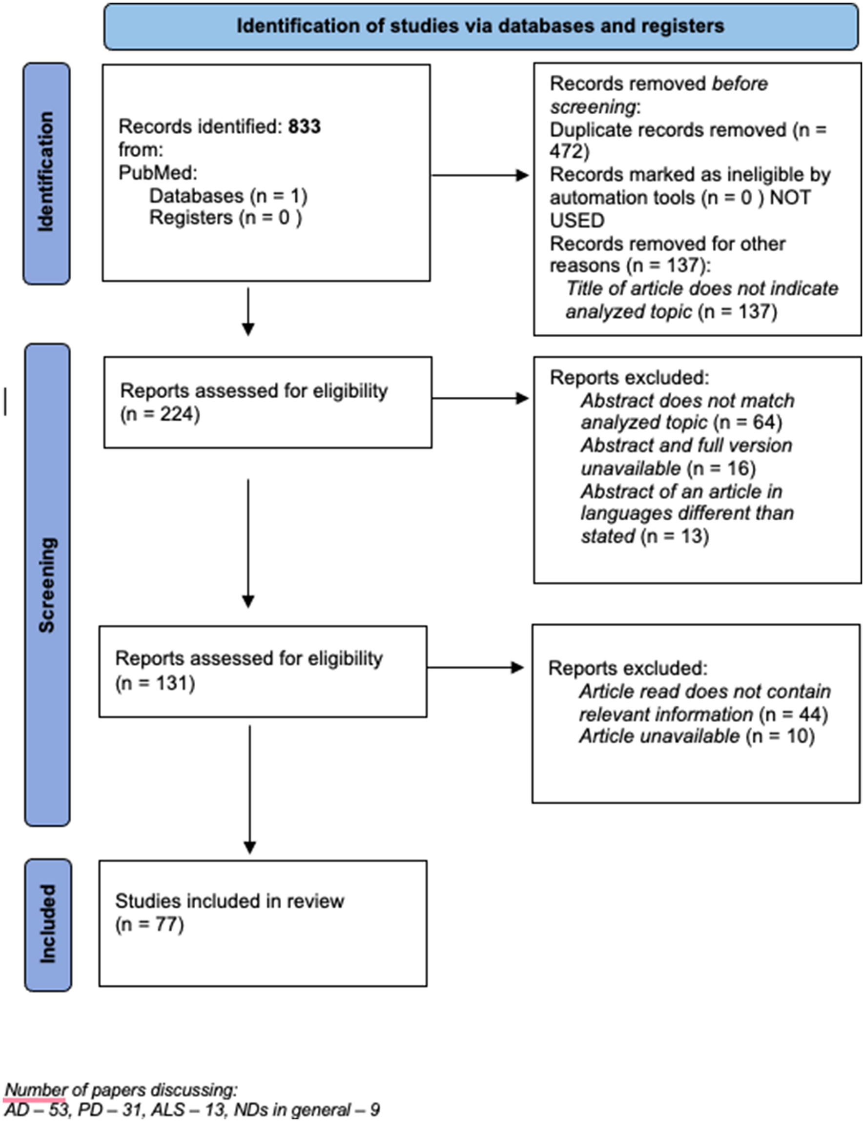 Figure 1. The method of the search strategy. Number of papers discussing : AD = 53, PD = 31, ALS = 13, NDs in general = 9.