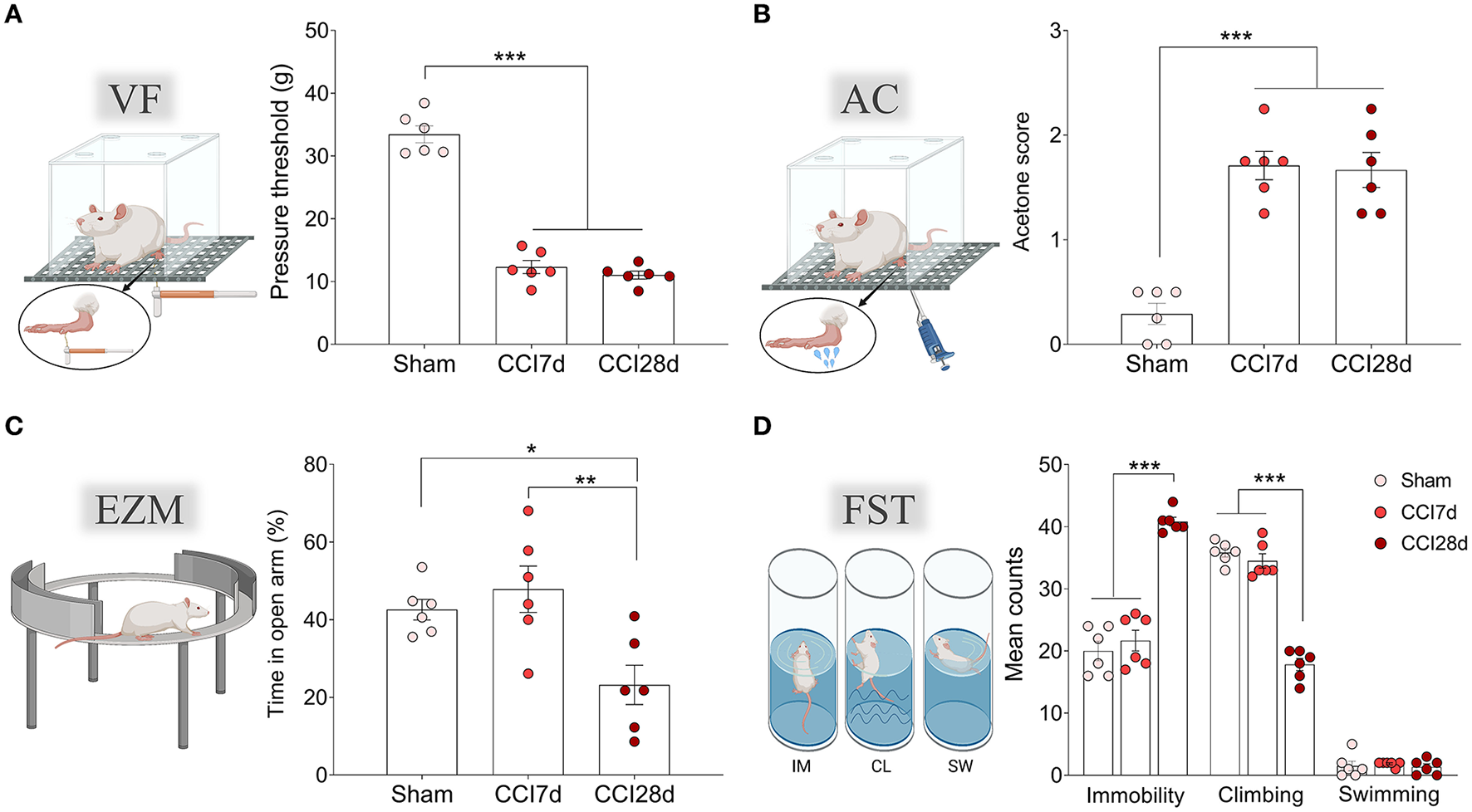Nociceptive and emotional behaviors after chronic constriction injury. (A) Mechanical hypersensitivity (g) of the ipsilateral paw in response to von Frey (VF) hair stimulation (0–50 g, 20 s). (B) Thermal hypersensitivity of the ipsilateral paw in response to acetone (AC) application (100 μl). (C) Anxiety-related behavior in the elevated zero maze test (EZM) and the relative time spent in the open areas (5 min test). (D) Depressive-related behavior in the forced swimming test (FST) relative to the predominant behavior (IM, immobility; CL, climbing; SW, swimming: 5 min test). Each bar represents the mean ± SEM of six animals/group: *p < 0.05, **p < 0.01, ***p < 0.001 as assessed by one-way ANOVA followed by Tukey's post-test.