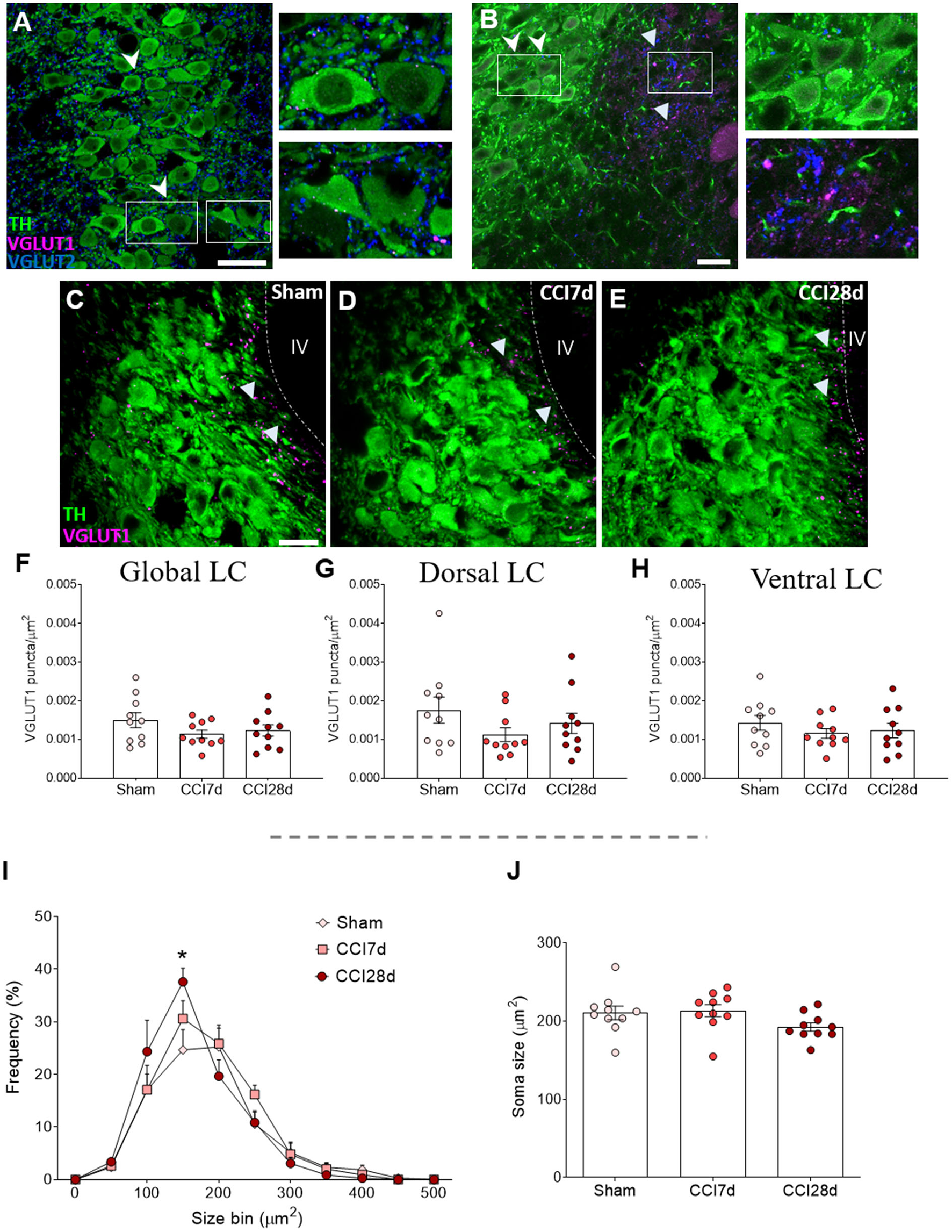 As a first approach, we assessed the distribution of excitatory VGLUT1 and VGLUT2 in the entire LC region. In accordance with previous studies, VGLUT1 expression was clearly evident around the pericoerulear region while VGLUT2 expression was prominent in both the pericoerulear region and surrounding the somata (Figures 2A,B: Barr and Van Bockstaele, 2005). When the density of VGLUT1 puncta was quantified across the whole LC region (Figures 2C–E), no significant differences were detected between the three experimental groups (Figures 2F–H). Similarly, there were no significant differences between the different groups in the size of the neuronal somata when the area they occupied was explored (Figures 2I,J). However, the frequency distribution of the soma sizes revealed an increase in the proportion of intermediate cells following CCI, which was significantly different in the CCI28d rats compared to the Sham group (150 μm2, p < 0.05; Figure 2I).