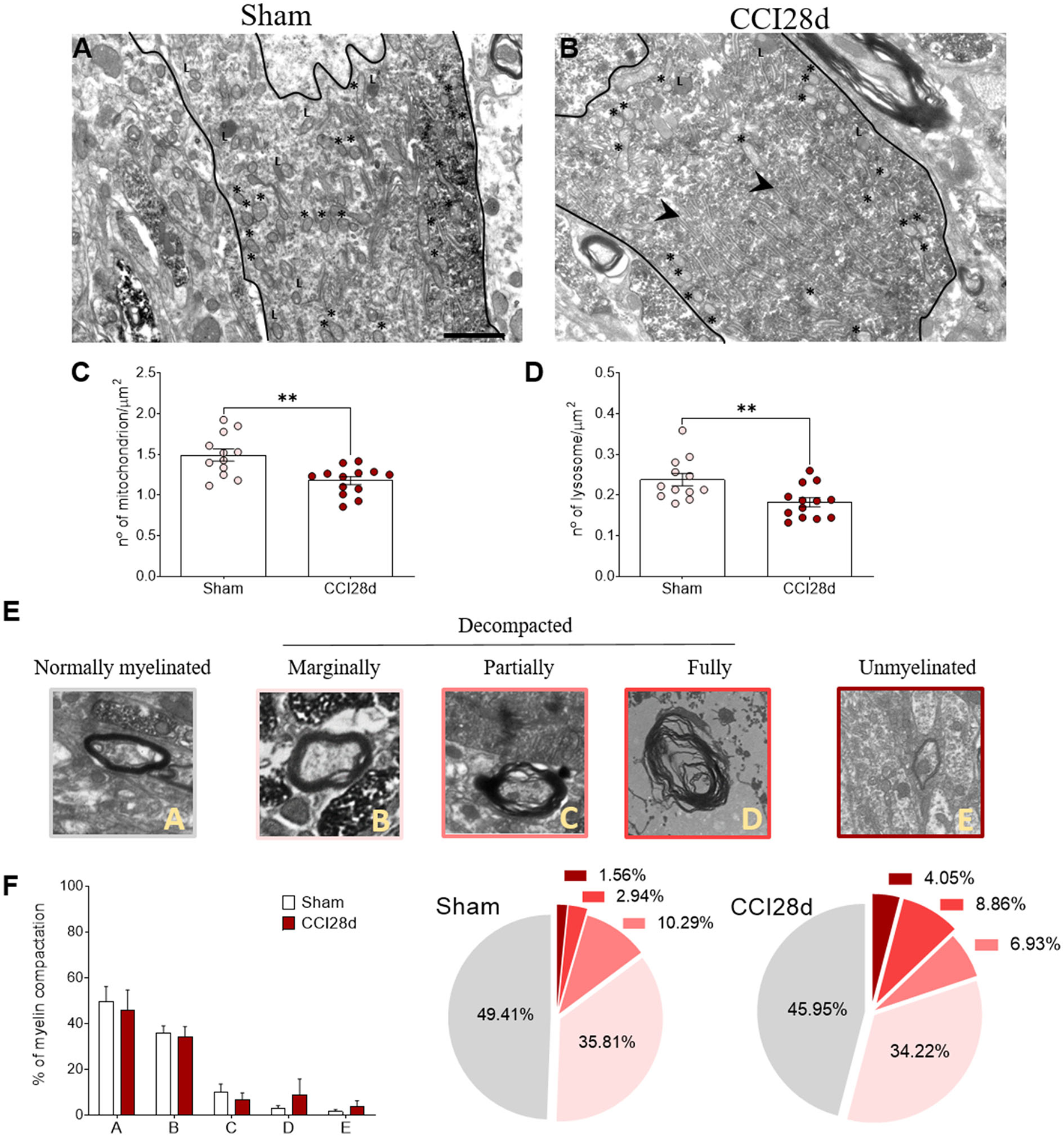 Ultrastructural studies of noradrenergic LC neurons in neuropathic pain rats. Representative electron microscopy images of (A) Sham and (B) CCI28d rats. The asterisks indicate mitochondria and the arrowheads point to the dilated ER: L, lysosome. Scale bar: 2 μm. (C,D) Quantification of the number of (C) mitochondria and (D) lysosomes. (E,F) Representative images and quantification of the relative myelin compaction scored from A to E as axons with normal myelin (A), marginally (B), partially (C), fully decompacted (D), and unmyelinated (E).