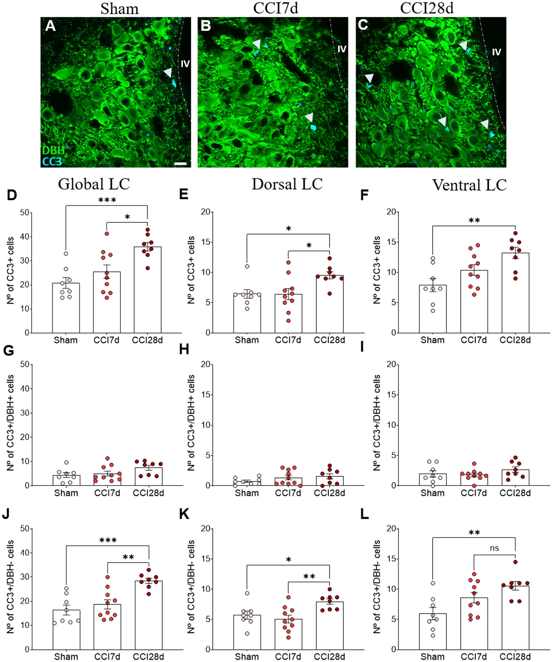 However, in the DBH− cells, one-way ANOVA revealed a significant effect of CCI surgery in the global (p < 0.001) and as well as in the dorsal and ventral region (p < 0.01) of LC. Tukey's multiple comparisons tests revealed that CC3 was detected more often in DBH− cells at CCI28d than in the Sham rats (p < 0.001) and this difference was lesser extent compared to CCI7d rats (p < 0.01: Figure 6J). The differences between the Sham and CCI28d were also evident in the dorsal but not in the ventral region of the LC (p < 0.01: Figures 6K,L).