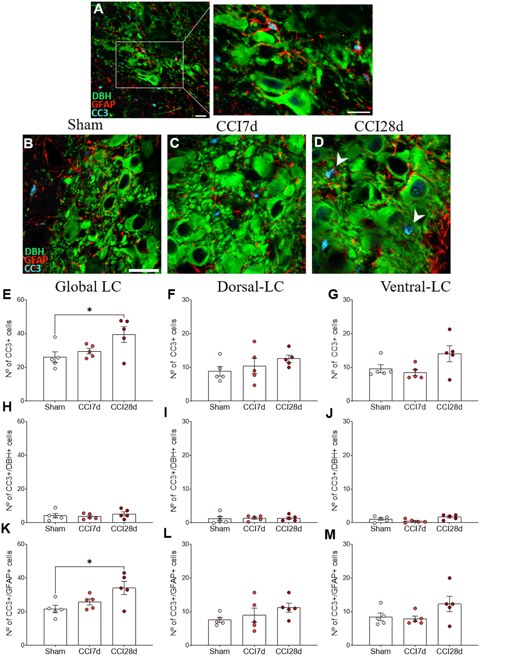 In the images captured, most CC3+ cells did not express DBH, suggesting that another type of cell was expressing CC3. When the density of CC3+ in DBH+ and DBH− was considered, the low density of CC3+ in DBH+ cells was similar in each experimental group (Sham 4.4 ± 2.7, CCI7d 5.1 ± 3.1, CCI28d 7.43± 2.7: Figures 6G–I).