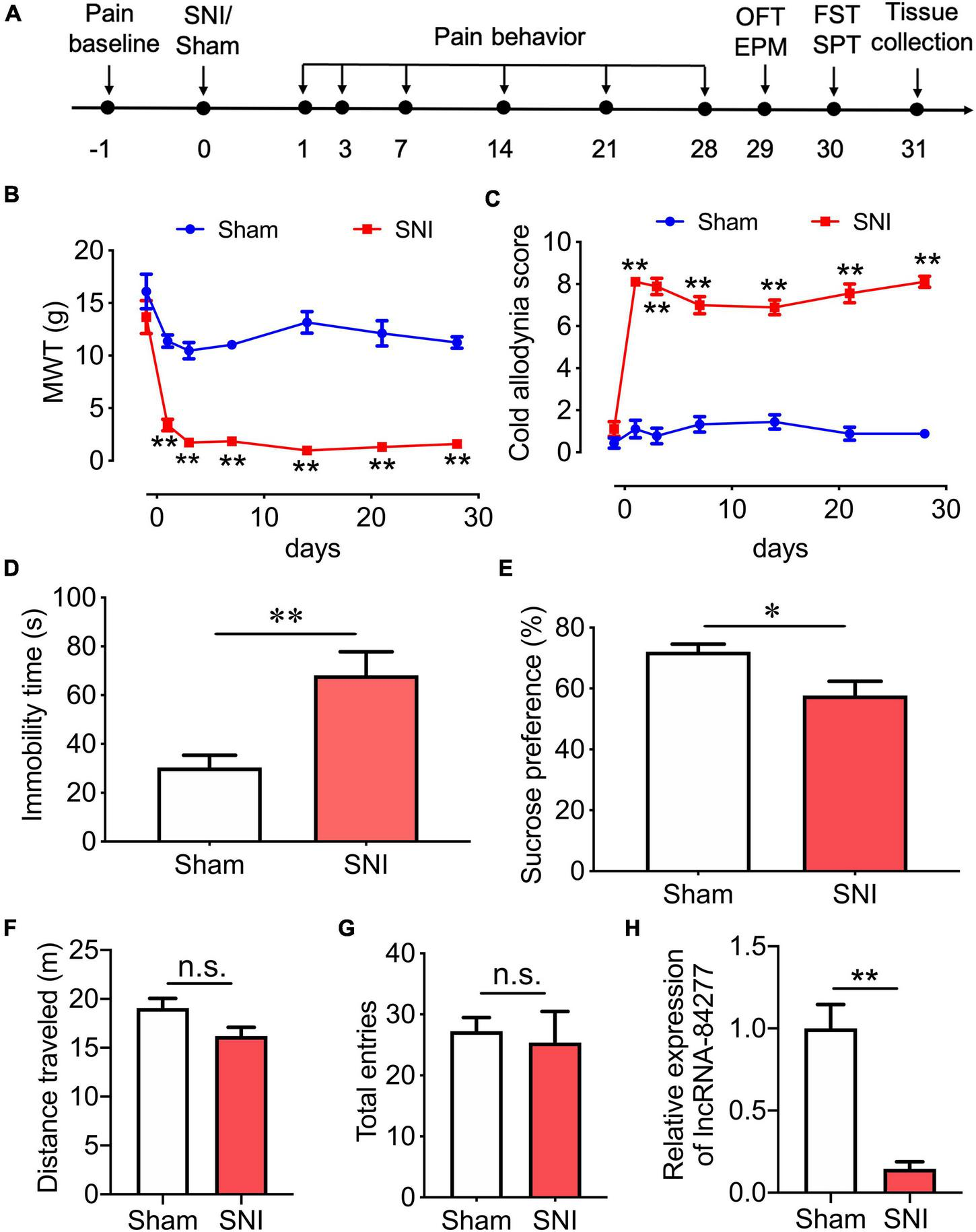 LncRNA-84277 is downregulated in CeA of SNI-induced depression rats. (A) Experimental timeline. (B,C) Sensory pain was assessed by the mechanical withdrawal threshold (MWT) for mechanical allodynia (B) and the cold allodynia score for cold allodynia (C) (n = 9). (D,E) Depression-like behaviors were assessed by the immobility time in the forced swim test (D) and sucrose consumption in the sucrose preference test (E) (n = 8). (F,G) Locomotor activity was assessed by the total distance traveled in the open field test (F) and the total entries to open arms and closed arms in the elevated plus-maze test (G) (n = 8). (H) The mRNA expression of lncRNA-84277 in the CeA of rats was determined by RT-qPCR (n = 8). All data are expressed as the mean ± SEM. *P < 0.05, **P < 0.01. n.s., not significant. OFT, open field test; EPM, elevated plus-maze test; FST, forced swim test; SPT, sucrose preference test.