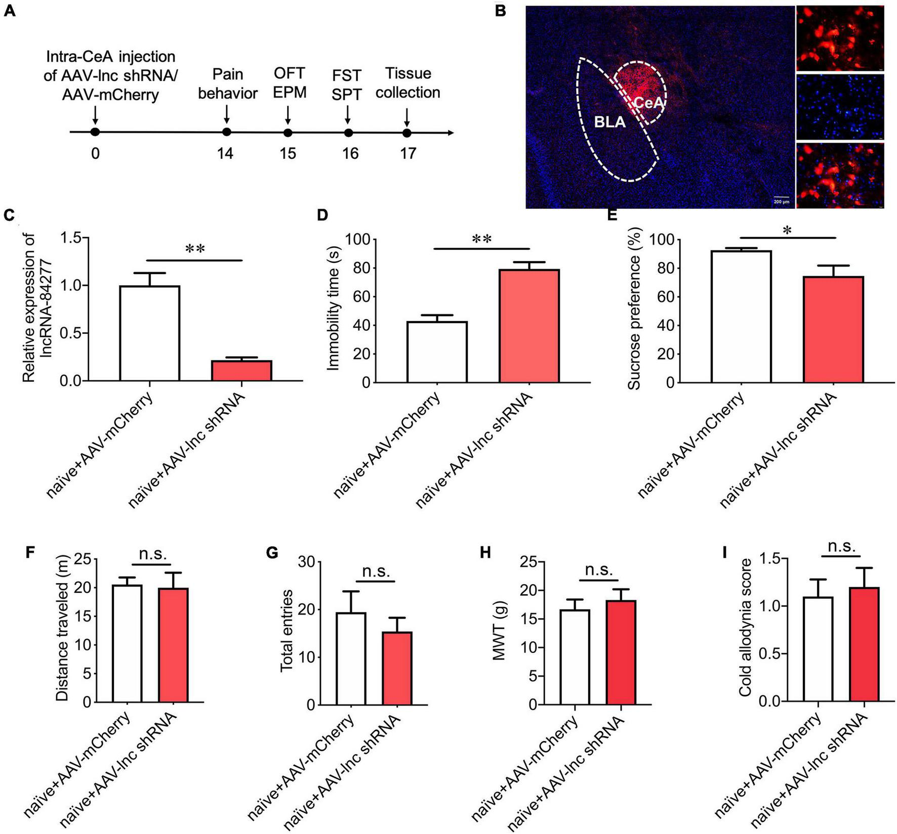 LncRNA-84277 knockdown in CeA induces depression-like behaviors in naïve rats. (A) Experimental timeline. (B) mCherry fluorescence in CeA after injection of an AAV vector carrying lncRNA-84277-specific shRNA (AAV-lnc shRNA). (C) RT-qPCR analysis of lncRNA-84277 expression in CeA after injection of AAV-lnc shRNA (n = 8). (D,E) Effect of lncRNA-84277 knockdown on depression-like behaviors in naïve rats assessed by the immobility time in the forced swim test (D) and sucrose consumption in the sucrose preference test (E) (n = 8–10). (F,G) Effect of lncRNA-84277 knockdown on locomotor activity in naïve rats assessed by the total distance traveled in the open field test (F) and the total entries to open arms and closed arms in the elevated plus-maze test (G) (n = 10–11). (H,I) Effect of lncRNA-84277 knockdown on sensory pain in naïve rats assessed by the mechanical withdrawal threshold (MWT) for mechanical allodynia (H) and the cold allodynia score for cold allodynia (I) (n = 10). All data are expressed as the mean ± SEM. *P < 0.05, **P < 0.01. n.s., not significant. OFT, open field test; EPM, elevated plus-maze test; FST, forced swim test; SPT, sucrose preference test.