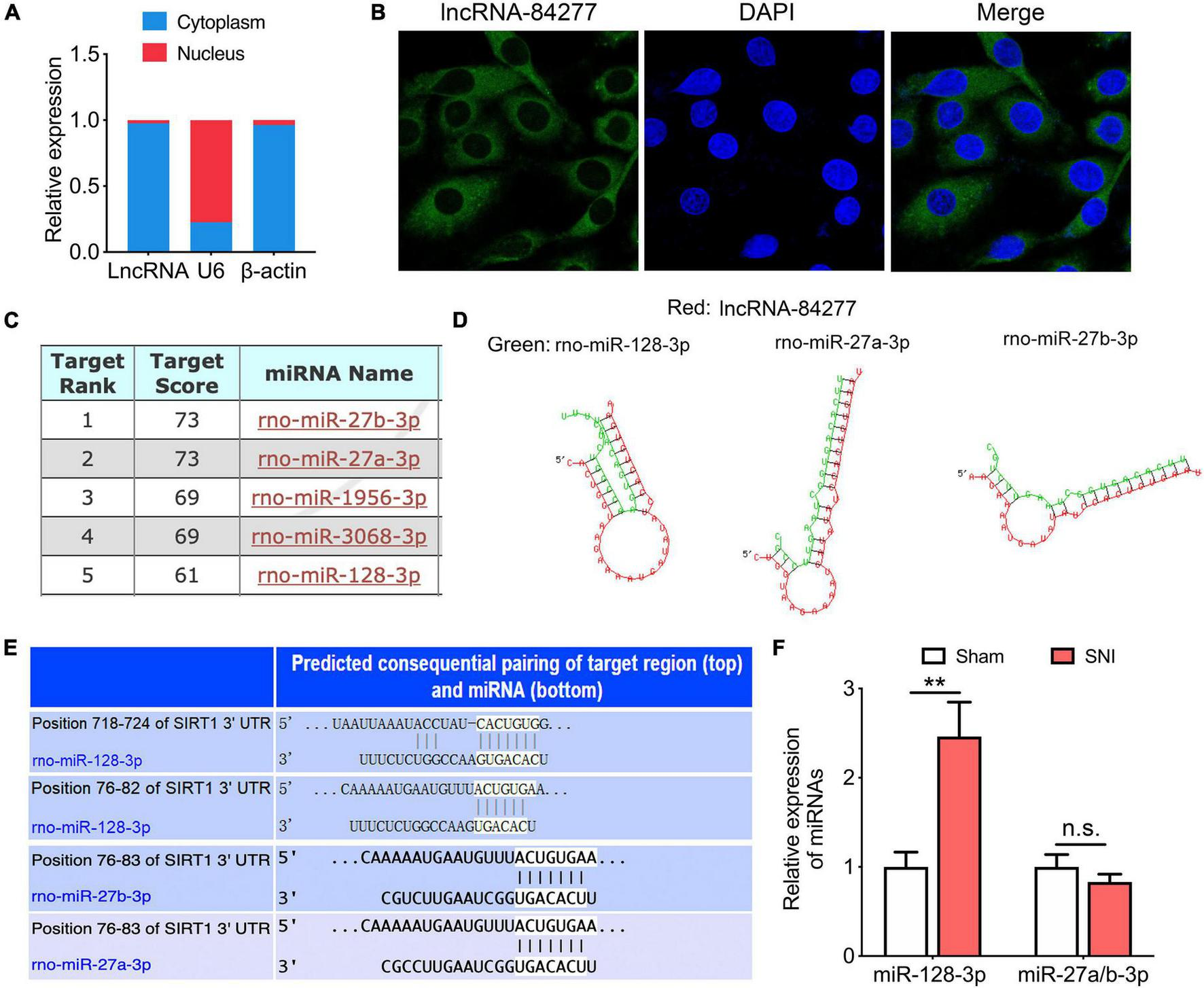 miR-128-3p is a target of lncRNA-84277. (A) The subcellular position of lncRNA-84277 in the cytoplasm or nucleus. β-actin and U6 were used as the cytoplasmic and nuclear control, respectively (n = 3). (B) RNA fluorescence in situ hybridization (FISH) for lncRNA-84277 (magnification × 1200). The lncRNA-84277 FISH probe was green and the DAPI nuclear dye was blue. (C) The top five miRNAs interacted with lncRNA-84277 predicted by miRDB (http://mirdb.org/). (D) The binding sites of the three miRNAs (miR-128-3p, miR-27a-3p, miR-27b-3p) and lncRNA-84277 identified by RNAhybrid (http://bibiserv.cebitec.uni-bielefeld.de/rnahybrid). (E) The binding sites of the three miRNAs (miR-128-3p, miR-27a-3p, miR-27b-3p) interacted with SIRT1 identified by TargetScan (http://www.targetscan.org/vert_72/). (F) The levels of the above three miRNAs in the CeA of rats were determined by RT-qPCR (n = 8). All data are expressed as the mean ± SEM. **P < 0.01. n.s., not significant.