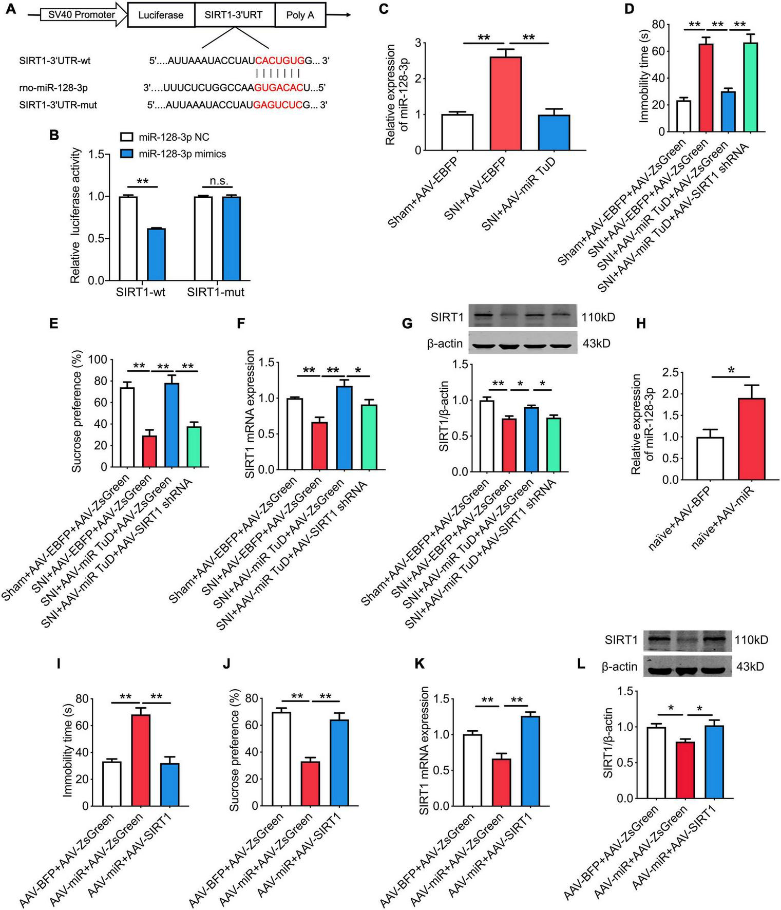 SIRT1 is the downstream target of miR-128-3p and is involved in chronic pain-related depression. (A) The predicted potential binding sites of miR-128-3p to SIRT1 and schematic of wild-type (wt) and mutant-type (mut) of SIRT1. (B) Relative luciferase activity of wild type or mutated SIRT1 after co-transfection with miR-128-3p mimics (n = 3). (C) Effect of intra-CeA infusion of AAV-miR-128-3p TuD on the level of miR-128-3p in SNI rats (n = 8). (D,E) Effect of SIRT1 knockdown on miR-128-3p knockdown-mediated improvement of depression-like behaviors in SNI rats determined by the forced swim test (D) and the sucrose preference test (E) (n = 8). (F,G) Effect of SIRT1 knockdown on miR-128-3p knockdown-mediated increase of SIRT1 mRNA (F) and protein (G) expressions (n = 8). (H) Effect of intra-CeA infusion of AAV-miR-128-3p on the level of miR-128-3p in naïve rats (n = 8). (I,J) Effects of SIRT1 overexpression on miR-128-3p overexpression-mediated depression-like behaviors in naïve rats determined by the forced swim test (I) and the sucrose preference test (J) (n = 8). (K,L) Effect of SIRT1 overexpression on miR-128-3p overexpression-mediated decrease of SIRT1 mRNA (K) and protein (L) expressions (n = 6–8). All data are expressed as the mean ± SEM. *P < 0.05, **P < 0.01. n.s., not significant.