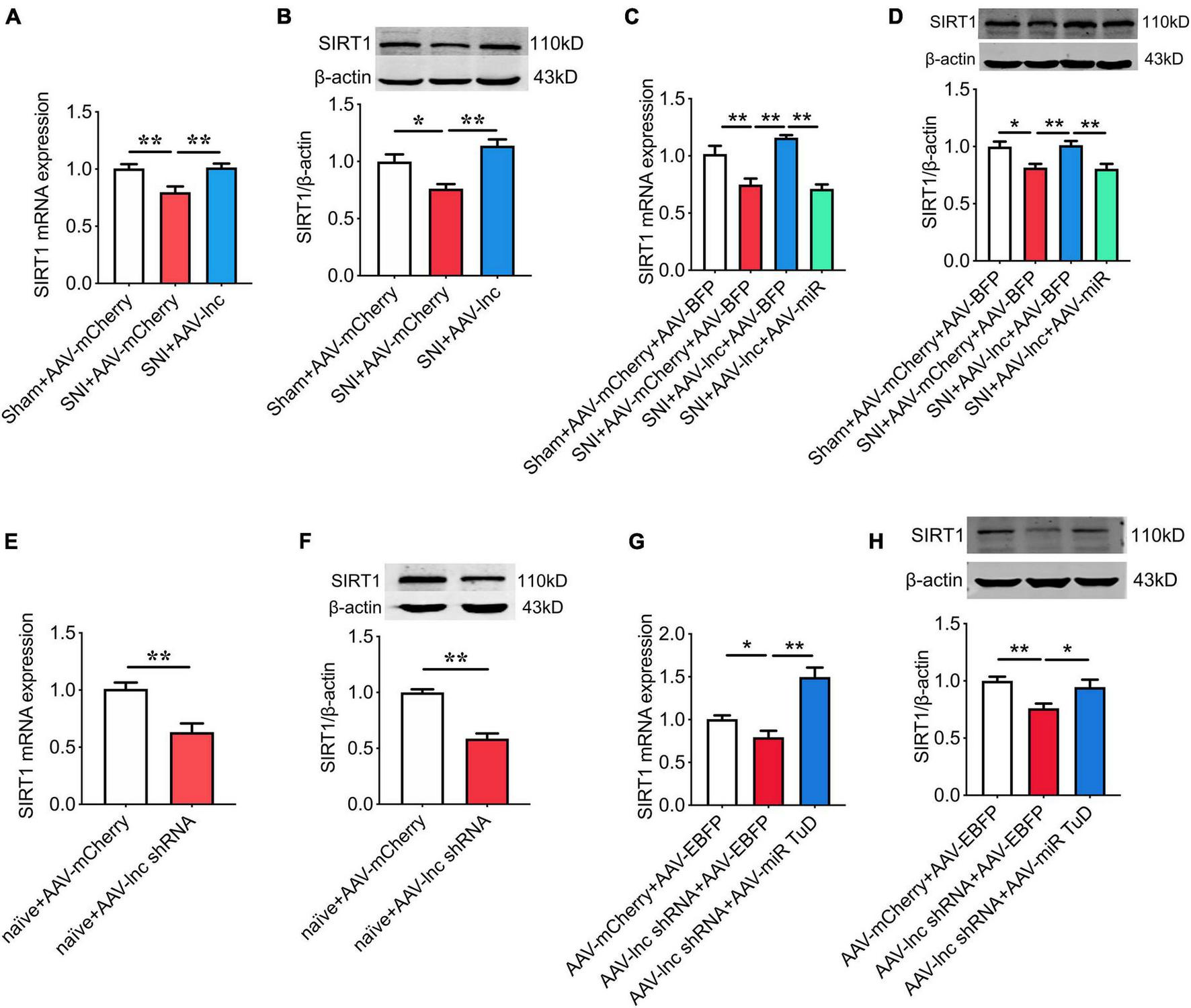 miR-128-3p is essential for lncRNA-84277 to regulate SIRT1 expression. (A,B) Effect of lncRNA-84277 overexpression on SIRT1 mRNA (A) and protein (B) levels in SNI rats. (C,D) Effect of miR-128-3p overexpression on lncRNA-84277 overexpression-mediated increase of SIRT1 mRNA (C) and protein (D) levels in SNI rats. (E,F) Effect of lncRNA-84277 knockdown on SIRT1 mRNA (E) and protein (F) levels in naïve rats. (G,H) Effect of miR-128-3p knockdown on lncRNA-84277 knockdown-mediated decrease of SIRT1 mRNA (G) and protein (H) levels in naïve rats. All data are expressed as the mean ± SEM. n = 8 for each group. *P < 0.05, **P < 0.01.
