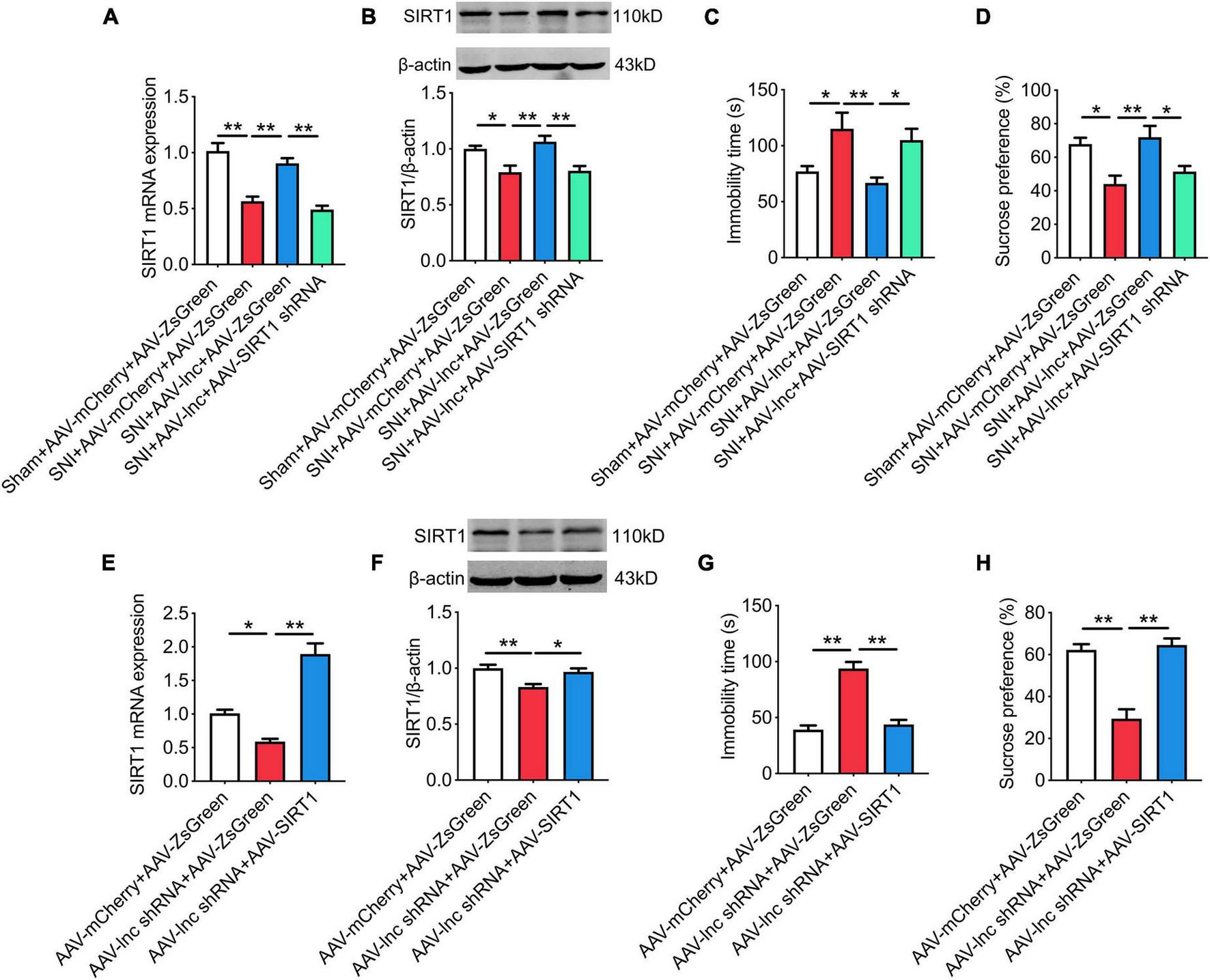 SIRT1 is essential for lncRNA-84277 to regulate chronic pain-related depression. (A,B) Effect of SIRT1 knockdown on lncRNA-84277 overexpression-mediated increase of SIRT1 mRNA (A) and protein (B) levels in SNI rats. (C,D) Effect of SIRT1 knockdown on lncRNA-84277 overexpression-mediated improvement of depression-like behaviors in SNI rats determined by the forced swim test (C) and the sucrose preference test (D). (E,F) Effect of SIRT1 overexpression on lncRNA-84277 knockdown-mediated decrease of SIRT1 mRNA (E) and protein (F) levels in naïve rats. (G,H) Effect of SIRT1 overexpression on lncRNA-84277 knockdown-mediated depression-like behaviors in naïve rats determined by the forced swim test (G) and the sucrose preference test (H). All data are expressed as the mean ± SEM. n = 8 for each group. *P < 0.05, **P < 0.01.