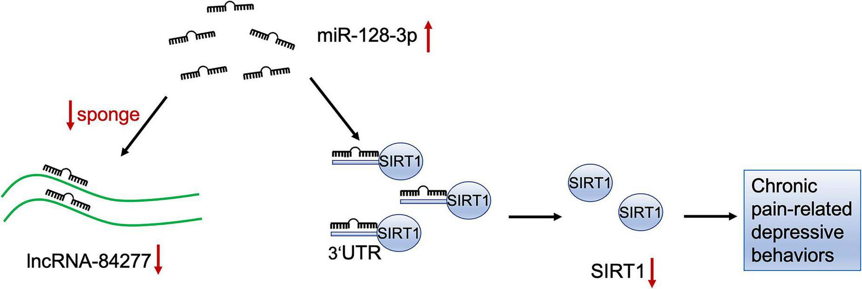The schematic diagram of the mechanism of lncRNA-84277/miR-128-3p/SIRT1 axis in chronic pain-related depression. LncRNA-84277 downregulation contributes to chronic pain-related depression-like behaviors by increasing the endogenous inhibitory effect of miR-128-3p on SIRT1.