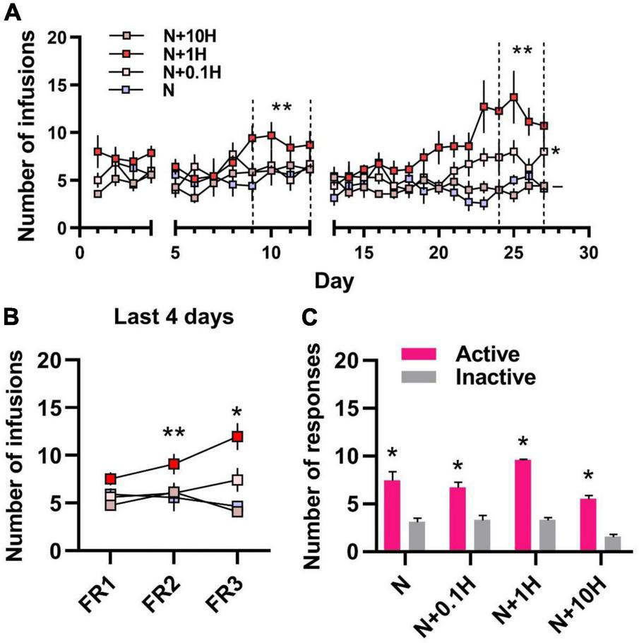 Self-administration of nicotine with different doses of harmane in rats. (A) Number of infusions in FR1-FR3 self-administration. Blue square, 30 μg/kg/inf nicotine group (N); pink square 30 μg/kg/inf nicotine + harmane (0.1 μg/kg/inf, N + 0.1H), red square, nicotine + harmane (1 μg/kg/inf, N + 1H) and brown square, nicotine + harmane (10 μg/kg/inf, N + 10H). The number of infusions in FR2-FR3 was significantly increased in the N + 1H group compared to the N group (**p < 0.01), while the N + 0.1H group was only significantly higher in FR3 (*p < 0.05), and the N + 10H group had no significant difference compared to the N group (–p > 0.05). (B) Infusions in the FR1-FR3 last 4 days in each group. The number of infusions increased significantly from FR1 to FR3 in the N + 1 group (**p < 0.01 from FR1 to FR2 and *p < 0.05 from FR2 to FR3), while other groups did not increase. (C) Histograms of the response data in FR1. Active responses were significantly higher in all groups than inactive responses (*p < 0.05). Data are presented in the figure using mean ± SEM.