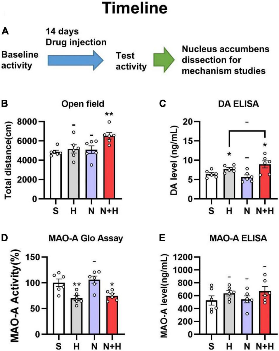 (A) Timeline of subcutaneous administration in rats. (B) Effects of nicotine and harmane on the open field total distance of the rats in S, H, N, and N + H groups after drug injection. Rats in the N + H group significantly increased the open field total distance (**p < 0.01), while no significant difference were found in the other groups. (C) Effects of nicotine and harmane on the basal level of dopamine in the nucleus accumbens. Compared to the S group, the dopamine level in the H and N + H groups increased significantly (*p < 0.05), but there was no significant change in the N group. (D) Effects of nicotine and harmane on the activity of MAO-A in the nucleus accumbens (NAc) of rats. Compared to the S group, the MAO-A activity in the H and N + H groups decreased significantly (*p < 0.05), but there was no significant change in the N group. (E) Effects of nicotine and harmane on levels of MAO-A in the nucleus accumbens (NAc) of rats. No significant difference was found in the all four groups. Data are presented in the figure using mean ± SEM.