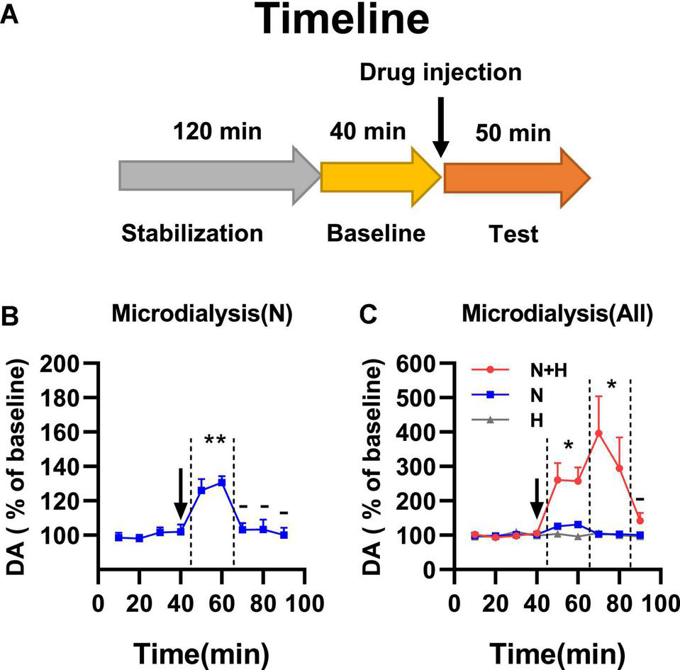 (A) Timeline of microdialysis study. (B) Effects of nicotine alone on dopamine release in nucleus accumbens. Significant dopamine release was showed in N group within 20 min of drug injection (**p < 0.01). (C) Effects of harmane and nicotine on dopamine release in nucleus accumbens. N + H group showed significantly increased release of dopamine compared to N group (*p < 0.05) in the first 20 min, and maintained high levels of extracellular dopamine in 40 min after injection compared to N group (*p < 0.05). Data are presented in the figure using mean ± SEM.