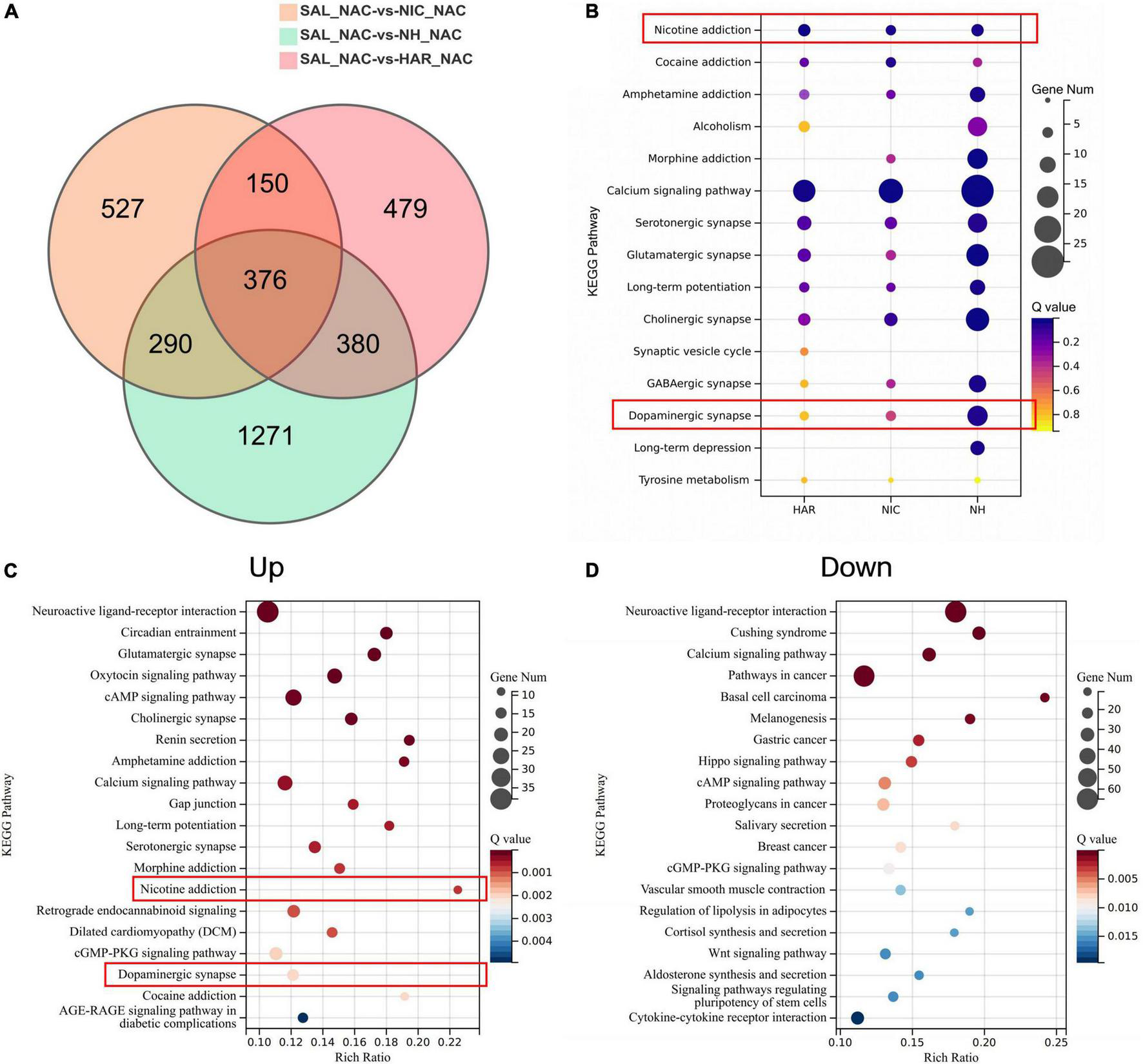 Analysis of differential genes and pathways in the nucleus accumbens transcriptome of self-administered rats. (A) Venn diagram of differential genes in three-group alignment. SAL, HAR, NAC, and NH refer to the S, 1H, N, and N + 1H groups. NAC refers to the nucleus accumbens. (B) Bubble plot of addiction-related pathways enriched for differential genes in the NH group. HAR, NIC, and NH refer to the intersection of HAR and NH (290 + 376), the intersection of NIC and NH (380 + 376), and the non-intersection of NH (1271). Bubble plot of pathways enriched by up-regulated (C) and down-regulated (D) genes in nucleus accumbens of NH group.
