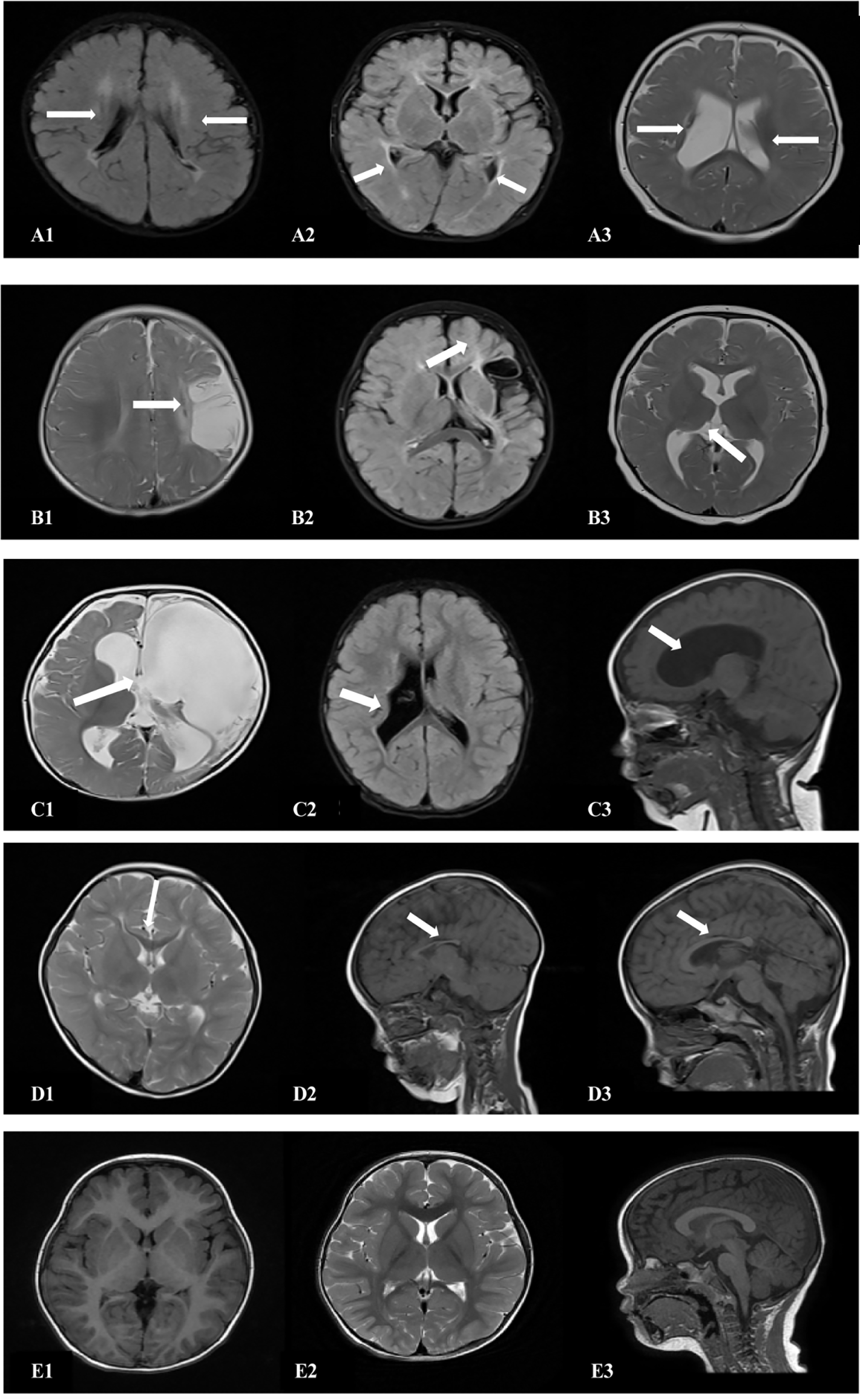Cranial MRI findings of the 18 patients in the ST group. (A1,2) (transverse): Irregularly shaped bilateral ventricles with nearby, irregular, patchy T1 and T2 hypersignals. (A3) (transverse section): Enlarged bilateral ventricles with nearby, patchy T2 signals. (B1) (transverse section): Left frontotemporal parietal atrophy with subcortical softening foci. (B2) (transverse section): Reduced volume of the left basal ganglia. (B3) (transverse section): Decreased volume of the left thalamus. (C1) (transverse): Left partial cerebral perforation malformation with supratentorial hydrocephalus. (C2) (transverse section): Right ventricular para-body brain penetration malformation with surrounding gliosis. (C3) (sagittal section): Supratentorial hydrocephalus. (D1) (transverse section): Thinning of the corpus callosum. (D2) (sagittal): Noticeably thinner and shorter corpus callosum. (D3) (sagittal section): Significantly shorter corpus callosum. (E1–3) (TI/T2 transverse/sagittal): Normal brain MRI.