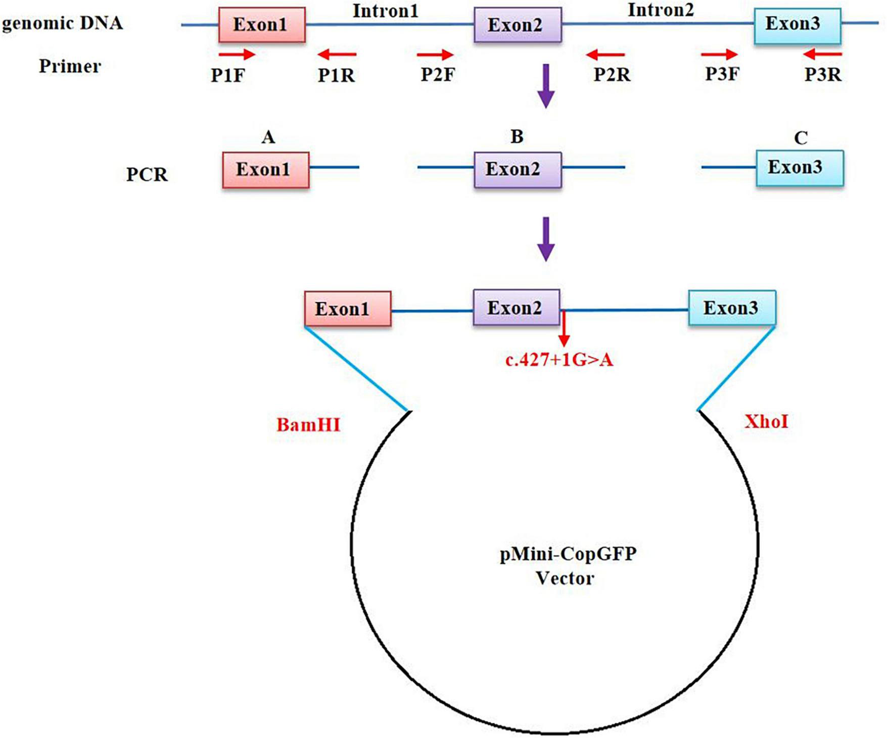 The in vitro minigene assay was carried out to examine the target gene regions covering BCL11B exon1-3, intron 1, and intron 2, and they were amplified from gDNA of the proband in Family 1. Due to the large size of the introns 1 and 2 of the BCL11B gene, the two introns were split and constructed in plasmid (Figure 2). Three pairs of overlapping primers (P1F/1R, P2F/2R, P3F/3R) were developed to amplify the heterozygous c.427 + 1G > A mutation site from the gDNA fragment by seamless cloning (Vazyme Biotech Co., Ltd., Nanjing, China). Then, the amplified DNA products were recombined and cloned into the two digestion sites (XhoI/BamHI) of the pMini-CopGFP vector (Hitrobio Biotechnology Co., Ltd., Beijing, China). Furthermore, the recombinant plasmids pMini-CopGFP-BCL11B-wt (wild type) and pMini-CopGFP-BCL11B-mt (c.427 + 1G > A) were validated through Sanger sequencing (P4F/4R). Subsequently, the plasmids were transfected into HEK293 cells. With total RNA extracted and reverse-transcribed into cDNA after 48 h of transfection, reverse transcription polymerase chain reaction (RT-PCR) was triggered by a primer pair of P5F/5R. Afterward, the cDNA products were examined using 1% agarose gel electrophoresis and further confirmed by means of Sanger sequencing. The length of wild-type cDNA products was determined as 711 bp.