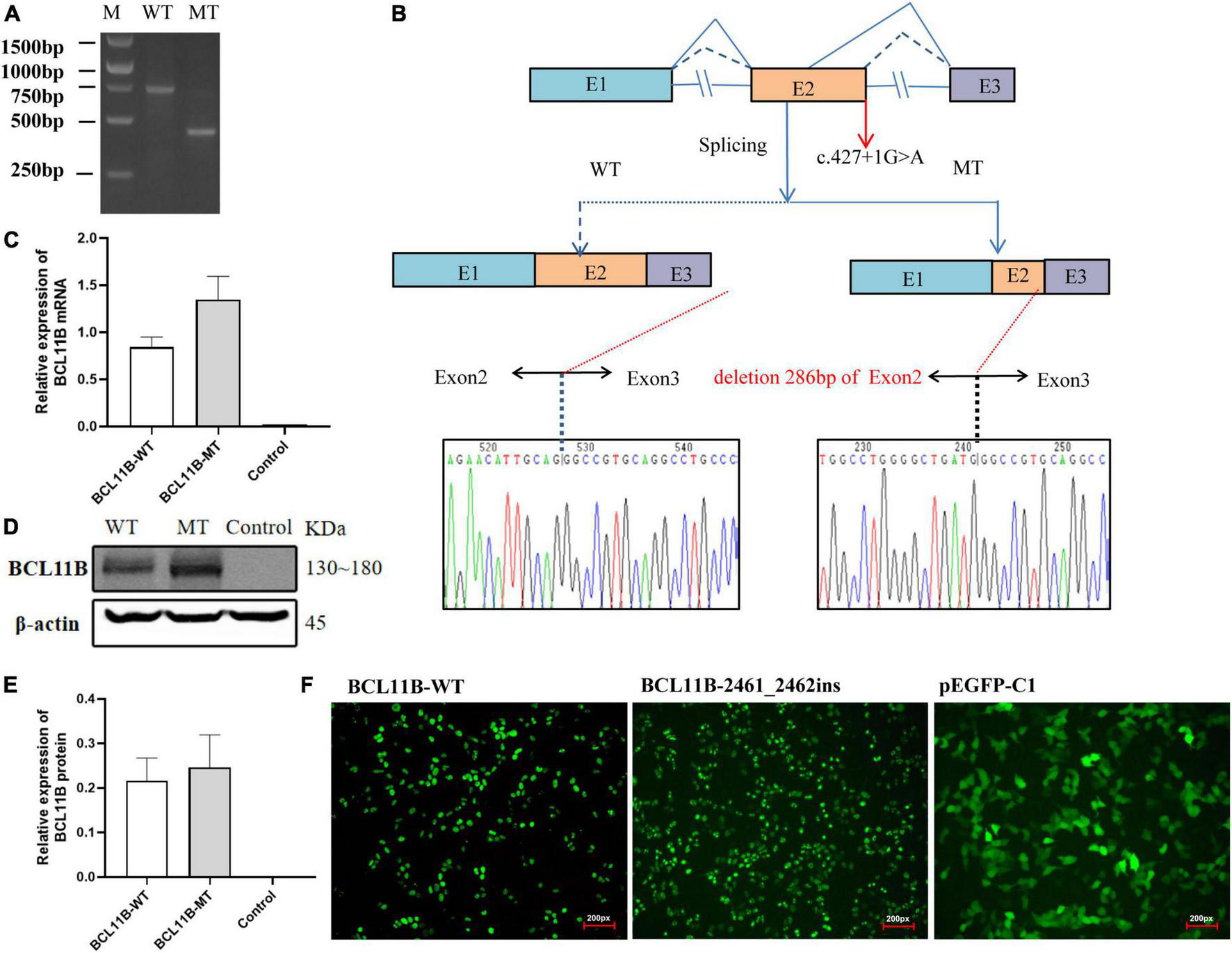 The in vitro minigene assay of the c.427 + 1G > A variant and the overexpression assay of the c.2461_2462insGAGCCACACCGGCG variant in HEK293T cells. (A) The identification of a shorter transcript with 286 bp deletion of the Exon 2 downstream, attributing to the activation of a novel cryptic 5′donor splice site in Exon 2. (B) A schematic diagram of the abnormal splice and Sanger sequencing of cDNA from transfected cells. (C) Quantitative analysis of mRNA expression of WT and frameshift mutant plasmids. (D) Western blot analysis of WT and frameshift mutant protein. (E) Quantitative analysis of protein expression of WT and frameshift mutant plasmids. (F) Fluorescent image (200px) of wild-type and mutant BCL11B-EGFP in HEK293T cells. Both wild-type and mutant types could be expressed, and there was no significant change in cell morphology and localization. M, DNA marker; WT, wild type; MT, mutant type.