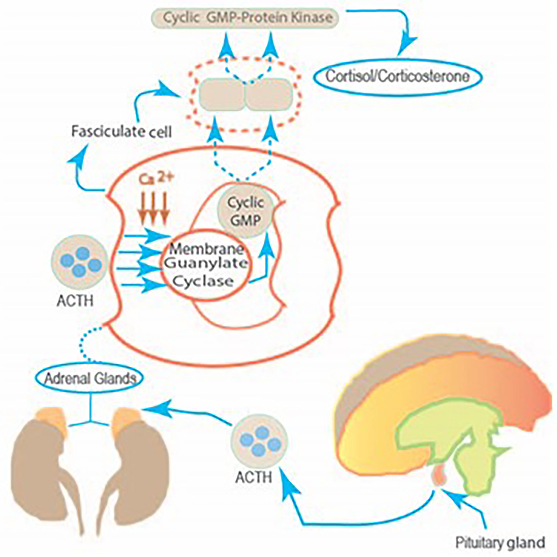 ACTH binds to its receptor located on the plasma membrane of the fasciculate adrenocortical cell. The Ca2+ regulates the transduction of information between hormone receptors and membrane guanylate cyclase. This leads to the increase in cyclic GMP which in turn, activates the cyclic GMP-dependent protein kinase activity, leading to the translation of a hypothetical preexistent mRNA. The synthesized protein controls the entry of cytoplasmic cholesterol into the mitochondrial precursor pool of cholesterol. The ACTH guided by these steps transforms this pool of cholesterol into the steroid hormone cortisol/corticosterone (Figure 2).