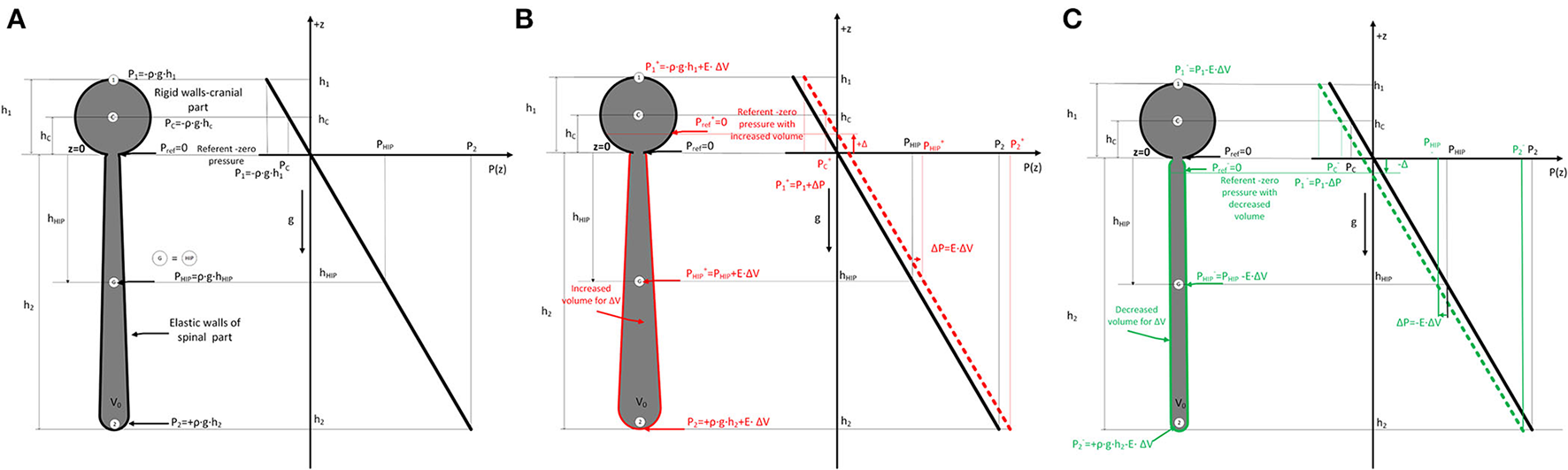 (A). Scheme of the cerebrospinal fluid system in cats (left) consisting of two parts (c-cranial with rigid walls and constant volume, bold black line; spinal part with elastic walls and variable volume) which are filled with fluid. The dimensions of the cranial (h1) and spinal (h2) parts, as well as the hydrostatic pressure equations, are shown according to the law of fluid mechanics (P = ρ x g x h), where ρ is the fluid density, g is the gravitational force, and h is the distance from the opening of the cranium where the pressure is measured. (Pref - reference pressure or zero hydrostatic pressure equal to atmospheric pressure; P1 - hydrostatic pressure at the highest point in the cranial part; P2 - hydrostatic pressure in the spinal part; PHIP – hydrostatic indifferent point defined by Magnes. Change of fluid pressure (ΔP) in the system with effective elasticity (E) of the spinal part and change of volume (ΔV) is described by equation ΔP=E·ΔV. Therefore, when adding volume (B) P= ρ x g x h + E·ΔV (red), and when removing (C) P= ρ x g x h - E·ΔV (green). According to the law of fluid mechanics, pressure is increased or decreased for this ΔP value everywhere in the system with shown spatial pressure distribution in the z-direction (right part) with referent fluid volume and increased/decreased fluid volumes. ΔP curve describing the spatial pressure dependence is translated for some value ΔP in all considered points in the system (1,C, G=HIP, 2). The position of the referent point (Pref) where the pressure is zero is moved cranially (red arrow) (B) or caudally (green arrow) (C) (+Δ and -Δ) when a small volume of fluid is added or removed from the system.