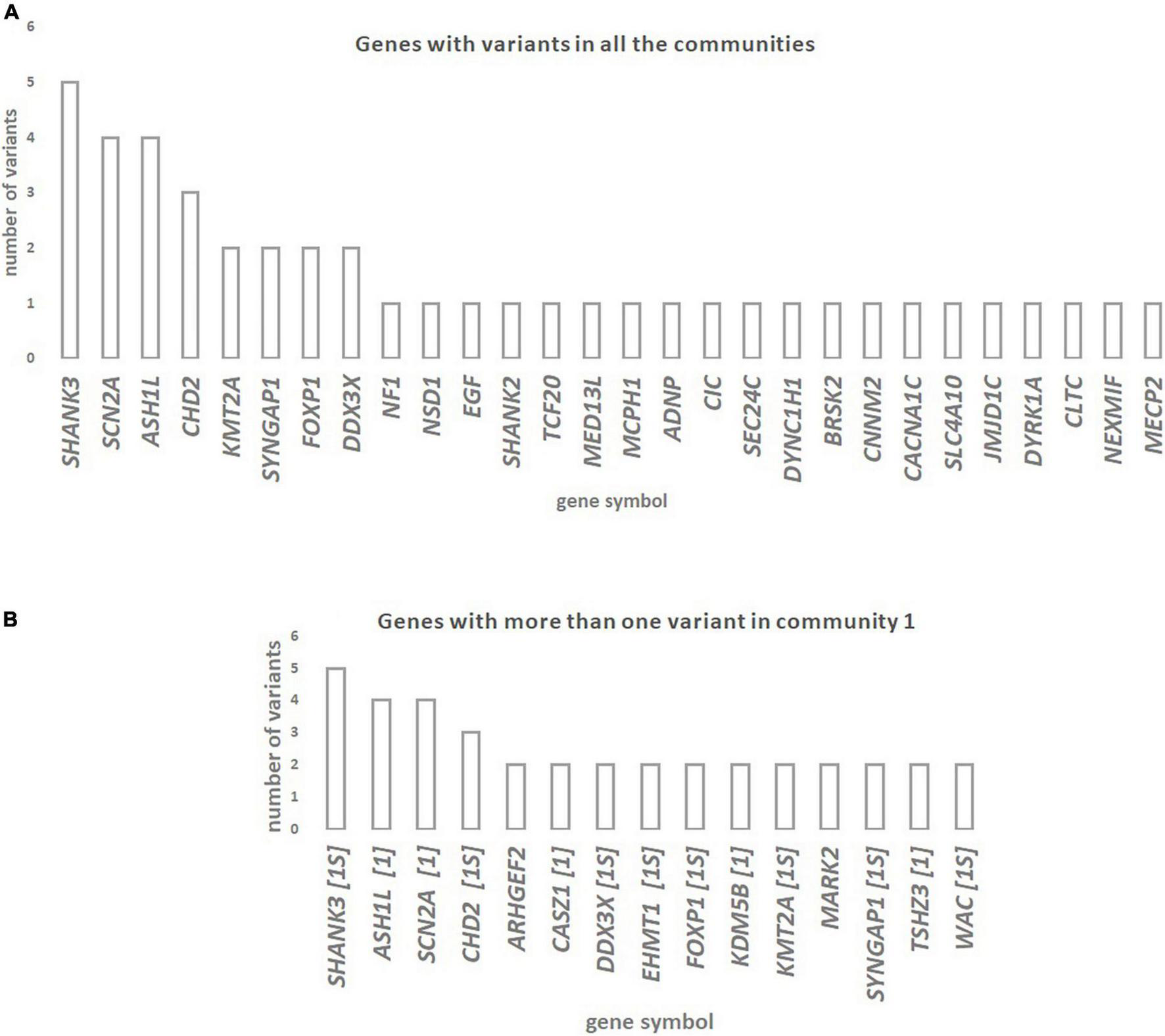 To validate the prediction that ASD patients have mutations in genes shared among comorbid brain disorders, we searched for Single Nucleotide Variants (SNVs), namely de novo loss of function (LoF) mutations, in an ASD Whole Genome Sequencing (WGS) public dataset. We focused on rare de novo mutations because this class of variants plays an important role in neurodevelopmental diseases, including ASD, ID, ADHD, and others. For this purpose, we searched the large dataset of genomic variants from WGS of ASD subjects available in the MSSNG database6 (Yuen et al., 2017; Supplementary File 1). MSSNG is a collaboration between the ASD organization Autism Speaks,7 Google, and the research community to create the world’s largest genomic database on ASD. MSSNG seeks to make data available from the WGS of 10,000 individuals from ASD families. The omitted letters in MSSNG (pronounced “missing”) represent the missing information about ASD that the project seeks to deliver (Yuen et al., 2017).