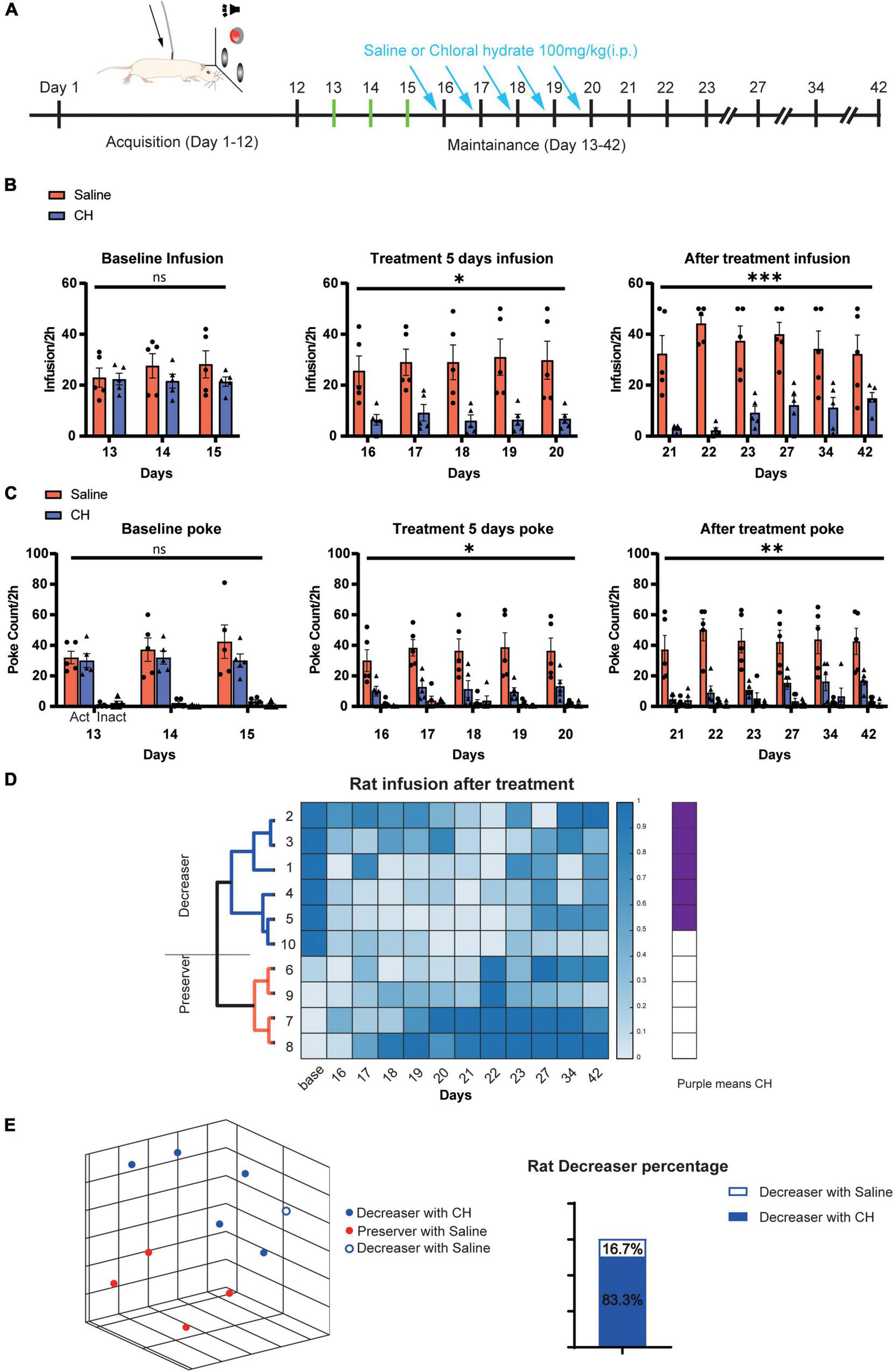 Chloral hydrate reduces drug-seeking behavior in Meth self-administration. (A) Representation of rat self-administration schedule. (B,C) Chloral hydrate reduced drug-seeking behaviors (N = 5 in the CH100 group, N = 5 in the saline group). (D) Hierarchical cluster based on uniform manifold approximation and projection (UMAP) of different parameters of maintenance session of Meth SA. Purple means CH100 treatment rats. The dark and light blue colors represent the normalized number of the infusion count. (E) The representation of three-dimensional UMAP clusters of decreaser (cluster blue) and preserver (cluster red) after treatment in Meth SA. *p < 0.05, **p < 0.01, ***p < 0.001; two-way ANOVA.