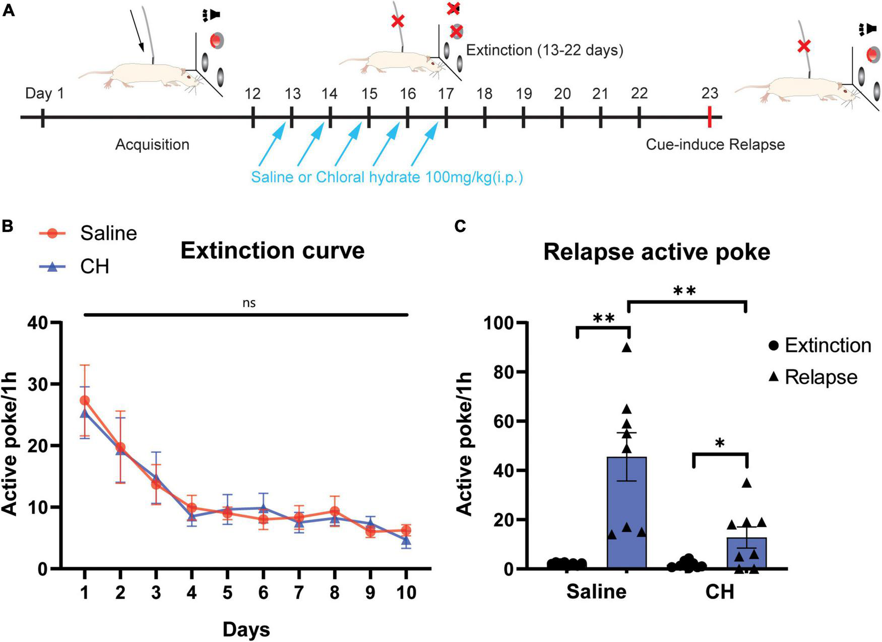 Chloral hydrate reduced cue-induced relapse without affecting extinction in Meth self-administration model (A) Representation of extinction and relapse schedule. (B) Chloral hydrate treatment (N = 12) has no effect on drug extinction, compared with saline control (N = 12). (C) Chloral hydrate treatment (N = 8) prevents cue-induced Meth relapse (N = 8 for CH group and N = 8 for saline group). *p < 0.05, **p < 0.01, ns: no significant difference, Student’s t-test.