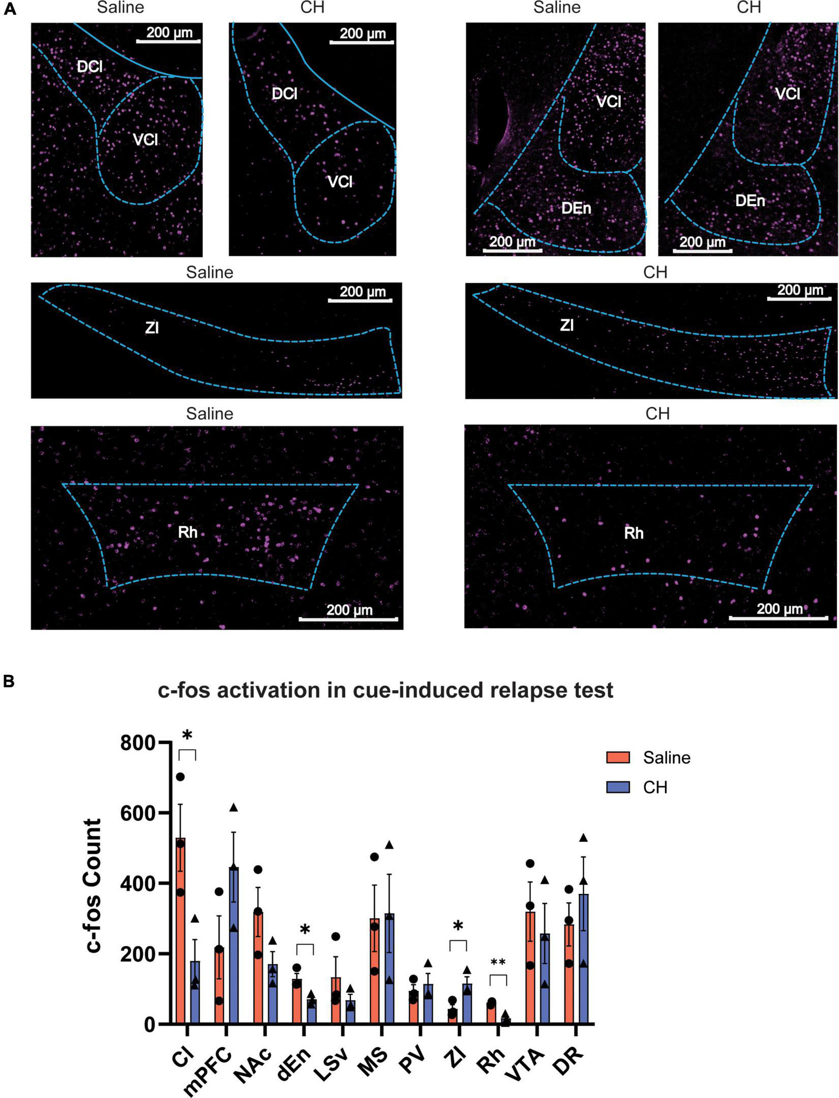 C-fos brain activation after cue-induced Meth relapse in saline- and CH-treated groups. (A) Example images showing c-fos expression of multiple brain regions after relapse test (N = 3 for both groups). (B) Quantification of brain regions with significant differences in c-fos expression between saline (red) and CH (blue) rats. p-values are presented in Supplementary Table 1. Abbreviations: rhomboid thalamic nucleus (Rh), dorsal endopiriform nucleus (dEn), zona incerta (ZI), claustrum (Cl), medial prefrontal cortex (mPFC), nucleus accumbens (NAc), lateral septal nucleus, ventral part (LSv), dorsal raphe (DR), medial septal nucleus (MS), paraventricular thalamic nucleus (PV), and ventral tegmental area (VTA). Student’s t-tests. *p < 0.05, **p < 0.01.