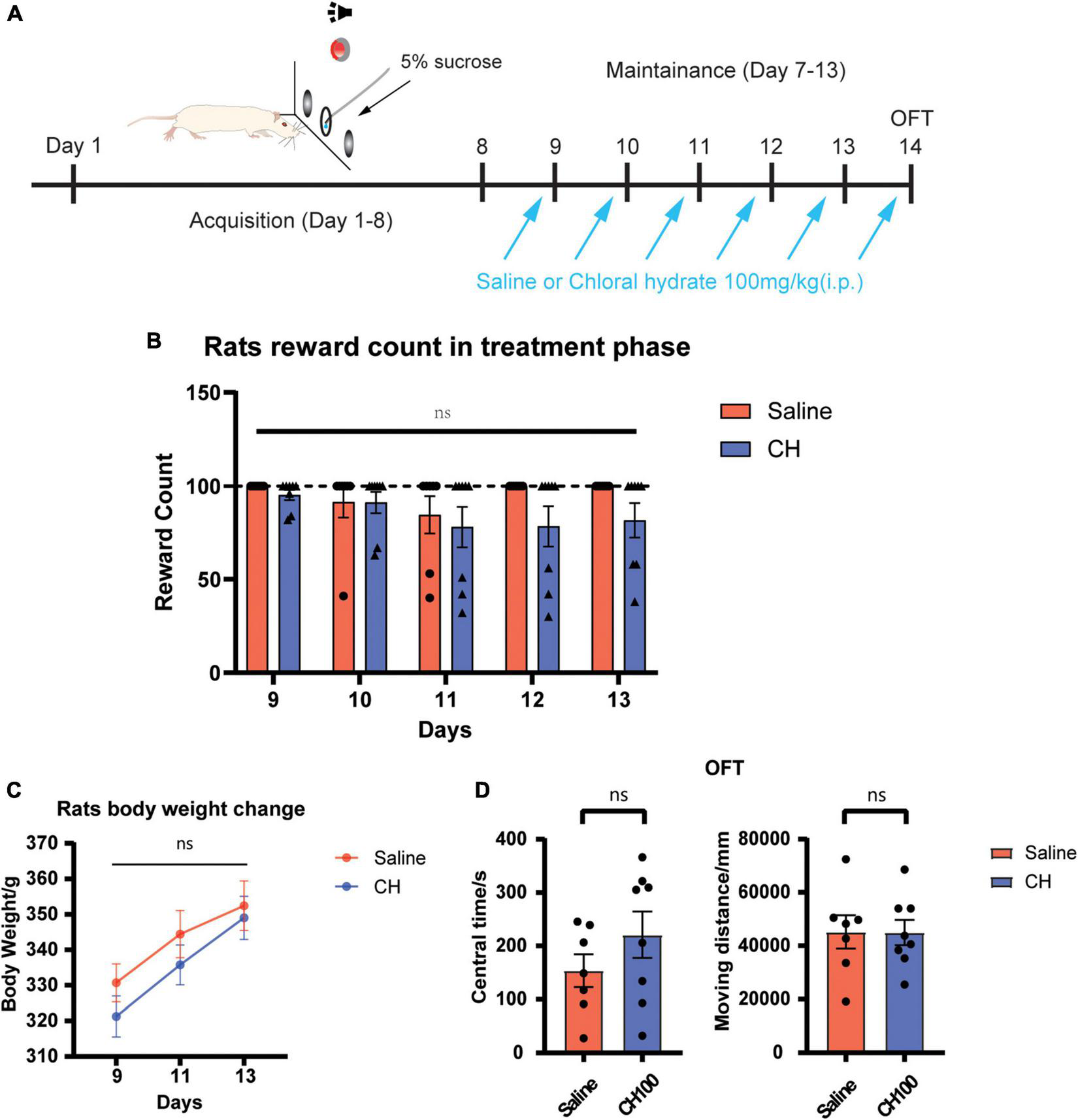 Chloral hydrate had no obvious side effects (N = 7 in Saline group and N = 8 in CH100 groups). (A) Timeline for sucrose self-administration. (B) Chloral hydrate did not affect sucrose self-administration behavior. (C) Chloral hydrate had no significant effect on the weight in rats. (D) Chloral hydrate did not change locomotor activity and anxiety mood.