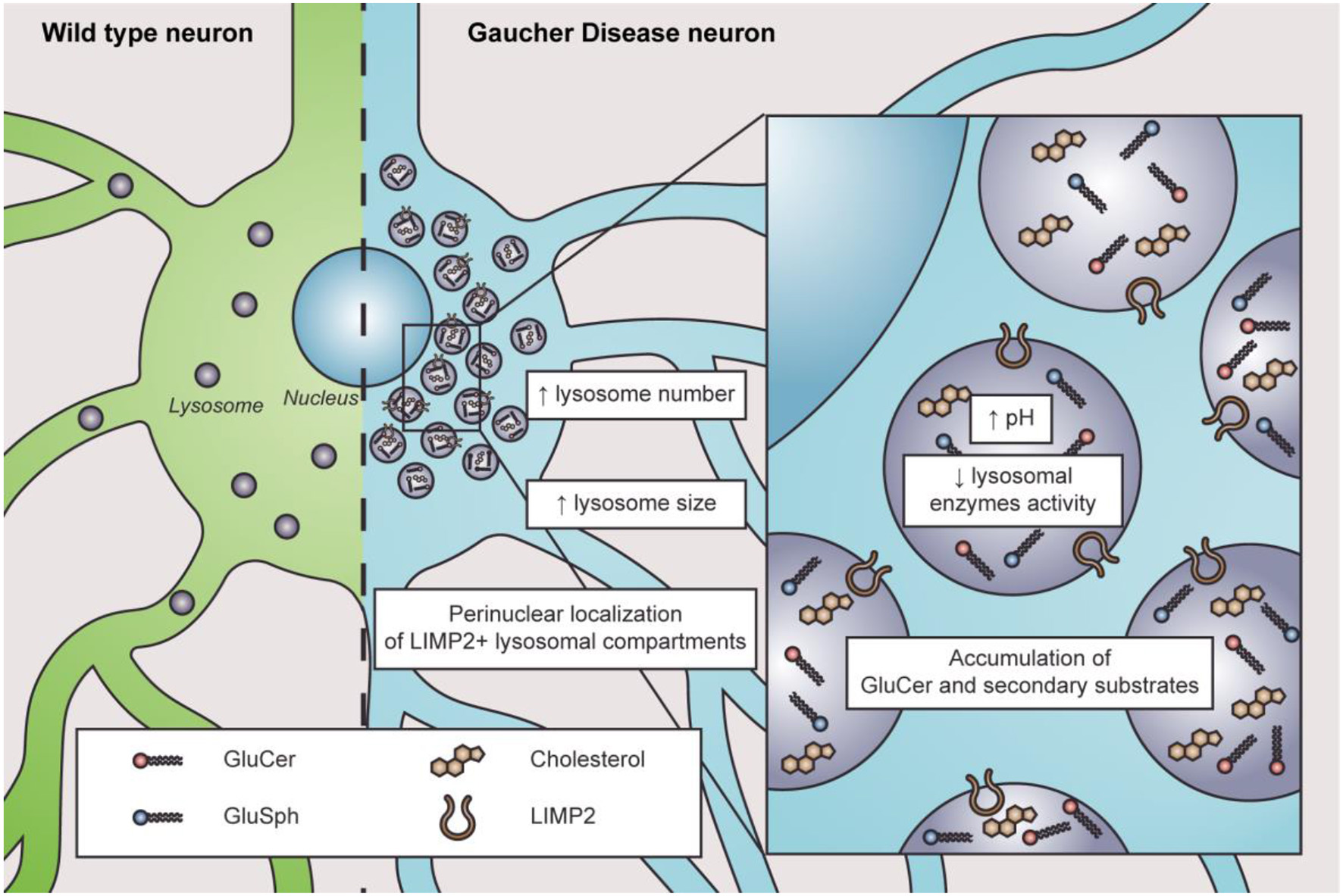 Characteristics of lysosome dysfunction in nGD. In physiological conditions, lysosomes are distributed throughout the cytosol in wild-type neurons (left in green). In nGD, lysosomes are increased in number and size with a perinuclear localization of LIMP2+ lysosomal compartments accompanied by elevated intraluminal pH and decreased lysosomal enzyme activity, along with the accumulation of GluCer and secondary substrates such as glucosylsphingosine (GluSph) and cholesterol (right in light blue).