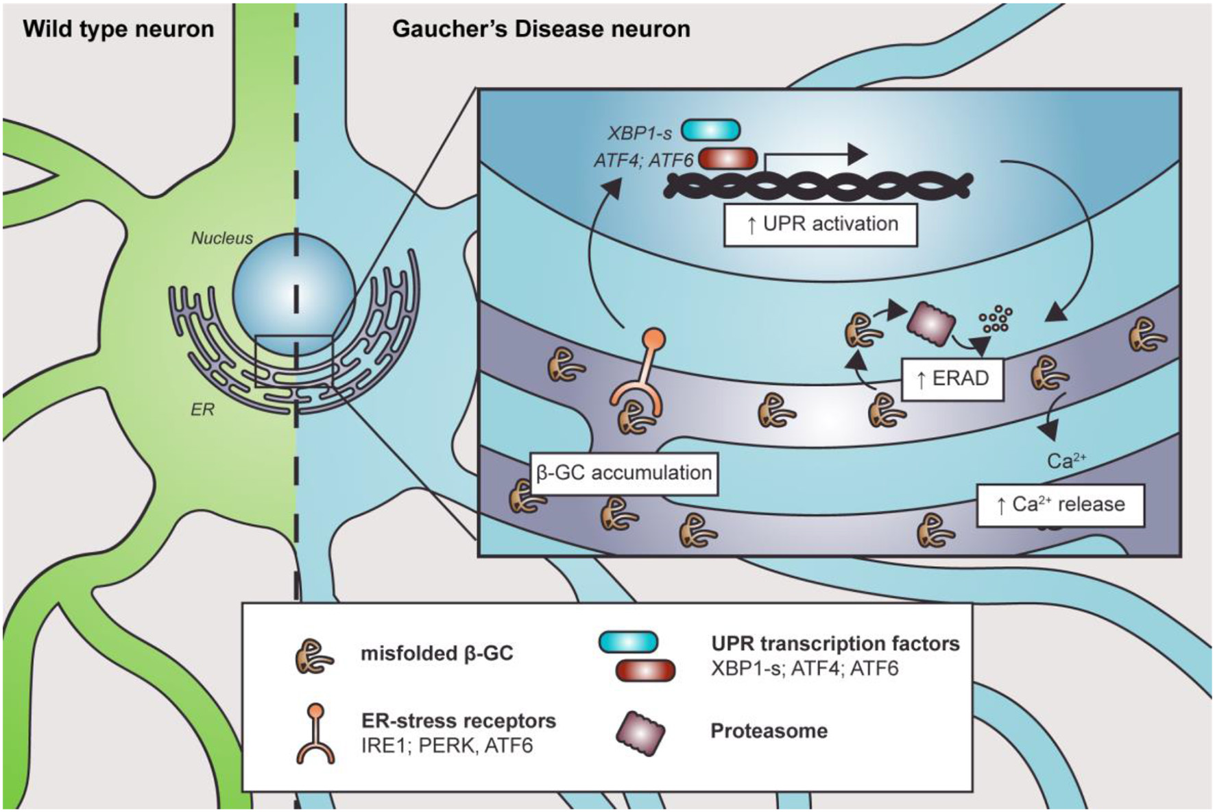 Misfolded β-GC mediates ER stress. Mutations in GBA1 lead to β-GC misfolding, promoting the activation of ER stress receptors and the UPR. This, in turn, induces degradation of the misfolded enzyme through ERAD. Along with this, Ca2+ homeostasis is also altered, contributing to cell and organelle damage.