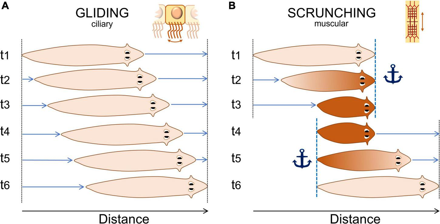 Normal “gliding” and noxious “scrunching” behavior representation. (A) Typical gliding behavior of planarians. They produce mucus and glide at a constant rate on a surface using ciliated cells located on their ventral side. Gliding speed is usually about 1–5 mm/s. (B) Typical noxious “scrunching” behavior. Scrunching is a muscular gait. The head is first anchored to the surface (t1), the body contracts (t2), anchor is switched from the head to the tail (t3 to t4), then the body elongates forward (t5), and loops to the first step (t6). The frequency of one loop varies between 0.2 and 0.8 Hz depending mostly on the species (Cochet-Escartin et al., 2015). Scrunching sometimes happen in reverse order, making the worm scrunch backward for a few seconds only.