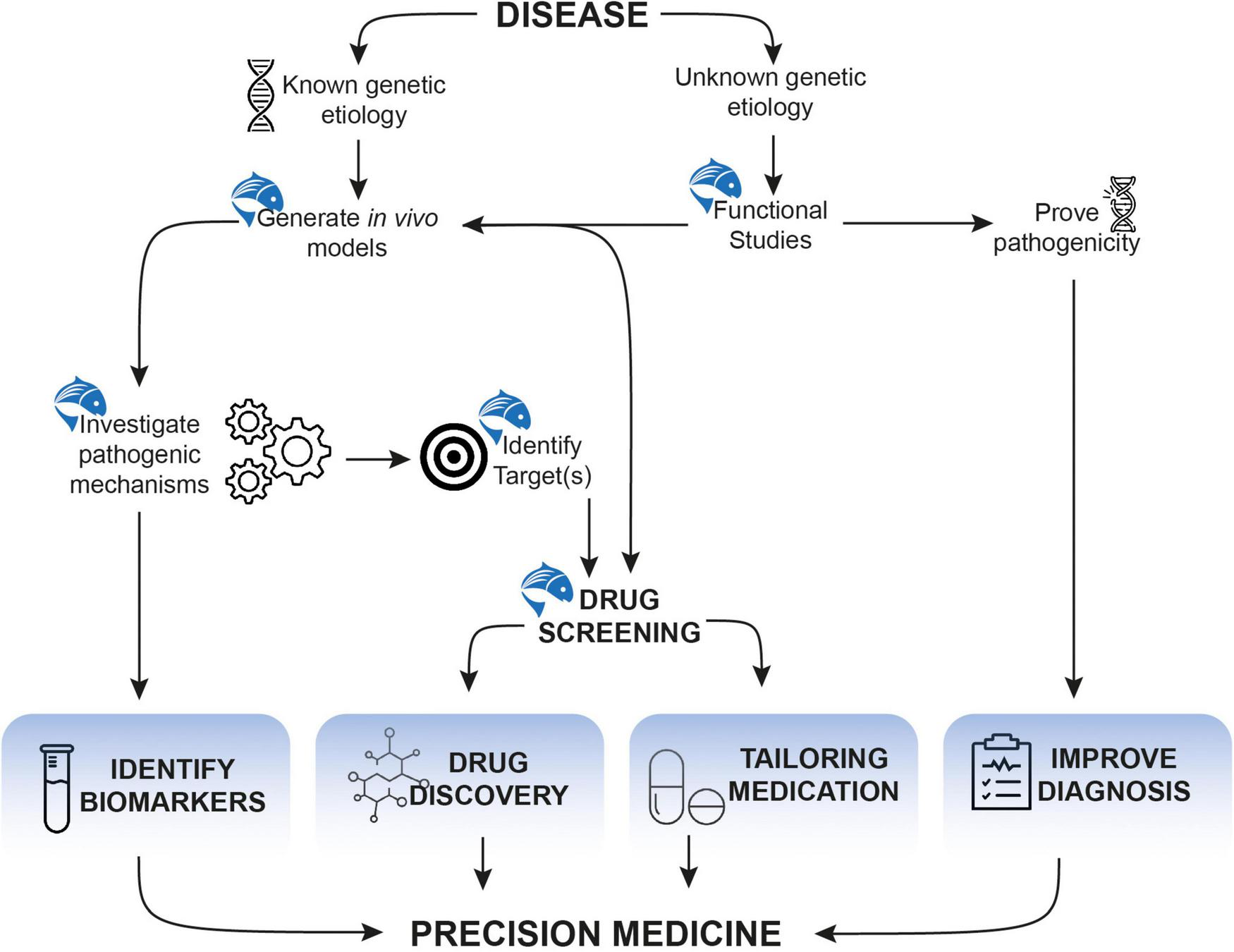 The popularity of zebrafish as a model is well-established as it is a formidable tool in the field of developmental biology, genetics, and pharmacology. Its use fits at multiple impactful levels of the broad precision medicine framework (Figure 3). Its success, popularity and utility will continue to grow as novel genetic engineering and innovative screening techniques will continue to emerge.